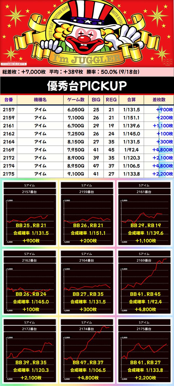 9月21日(日)│エスパス渋谷本館│3回目の9月日曜日、安定度で強さを見せたのは8機種のジャグ!全体で1台平均+500枚overの安定ぶり!その他1/2系の仕掛けも散りばめて周年日への準備は万端!