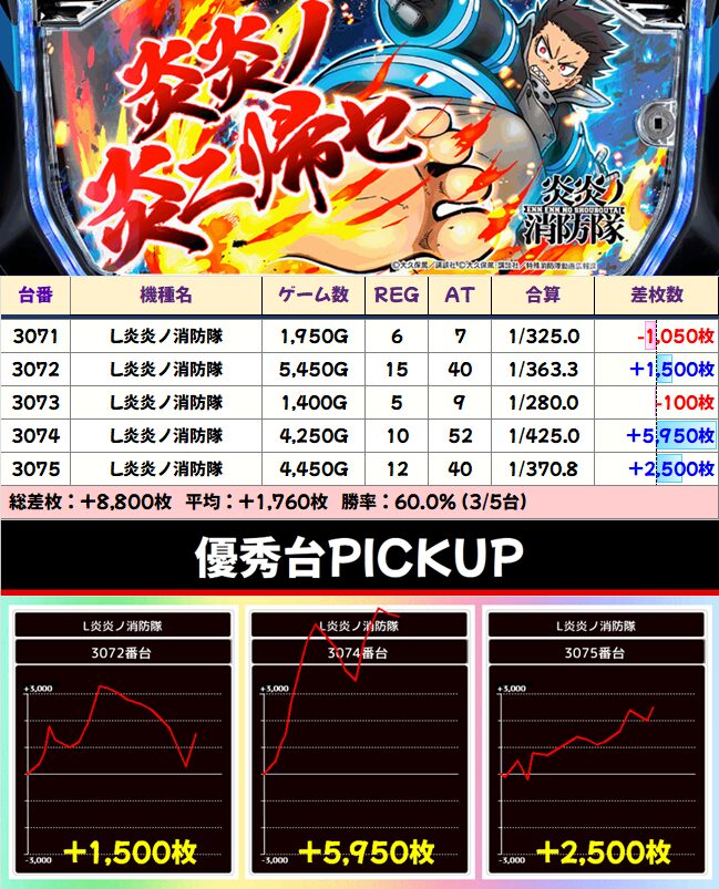 不発の台は素早い見切りで離脱。他の台はプラス域をしっかりキープ。3075番台は炎炎らしからぬjかなり安定したグラフ挙動。