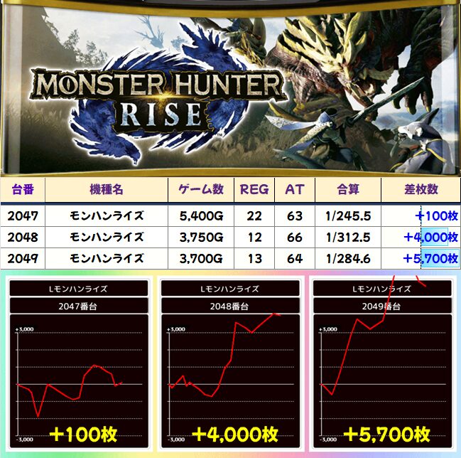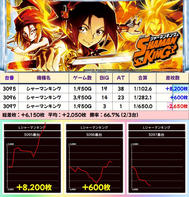 3095番台は中盤からのATで大量上乗せを一気に果たしたか。それがそのまま継続にも影響するので、着火すると相当な伸びを見せるのがマンキン。