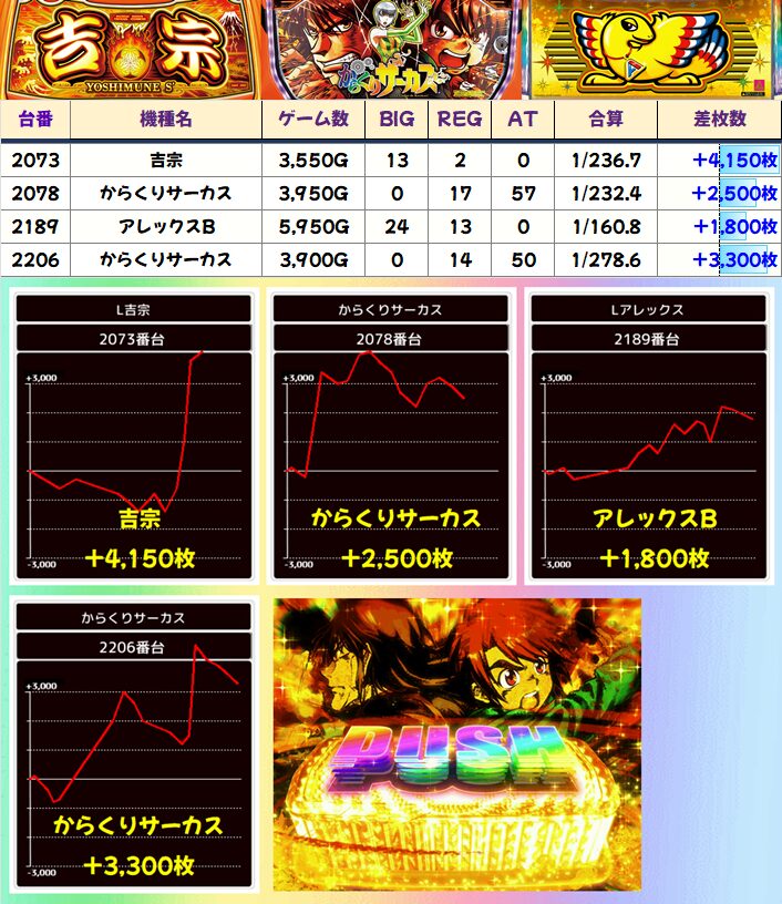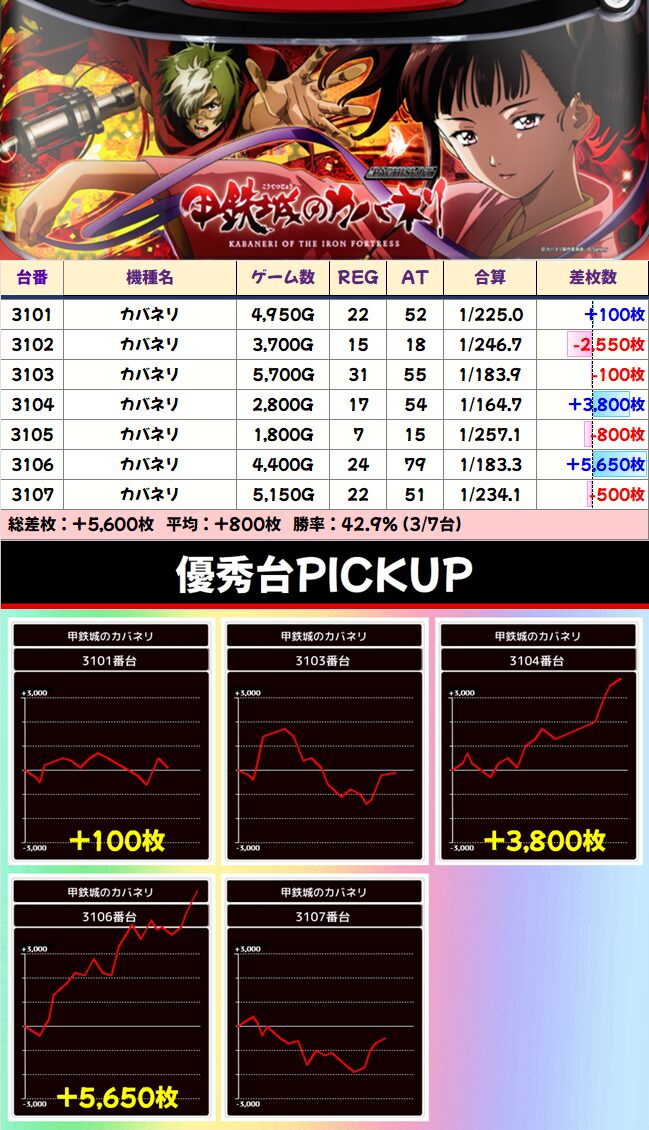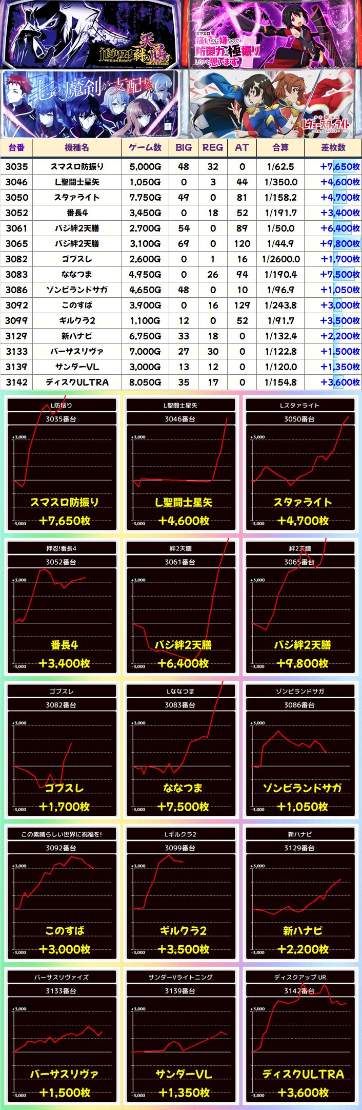 防振りとななつま、そして天膳による伸び方がだいぶ派手です。安定しているのは新ハナビ・バーサスなどのノーマル系、そして6.4号機であるこのすばAT機も非常に優秀。