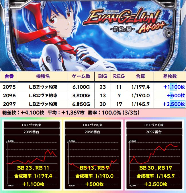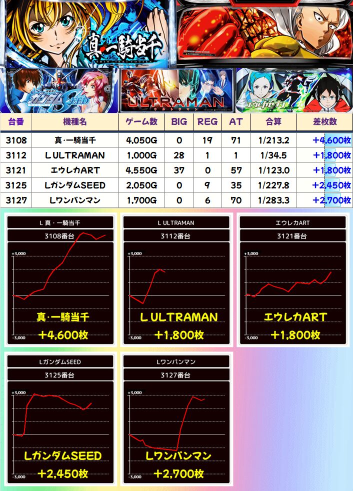 真・一騎当千のグラフがこの台の上挙動で見られる右肩上がりになってますね。ワンパンマンはその名の通り一撃出玉、エウレカARTはジワジワと伸ばしてます。