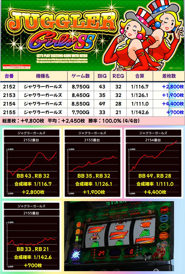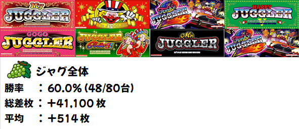全体での勝率が60%と高く、1台平均でも+500枚を超えてきています。前からジャグは抜き出して個別にまとめていますが、今回もその傾向は変わらず。安定を求めるならジャグから狙うのもアリかもしれませんよ?