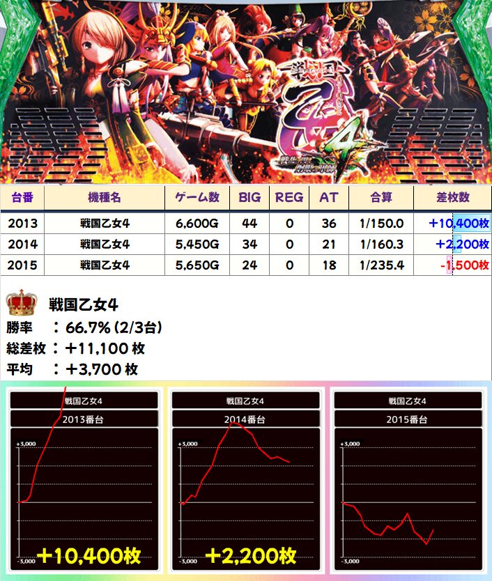 万枚が飛び出しました。AT関連はいずれもよかったのですが、ボーナス関連で2015番台は不発に終わったか?ちなみにバラエティにも乙女4はあり、そちらはプラスの模様。