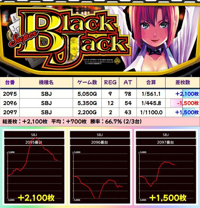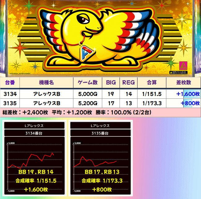 甘さでいえばBT機のアレックスも別格。しっかりBIGを引ければプラス域をキープし続けられてますね。351枚以上の出玉はかなり大きい。