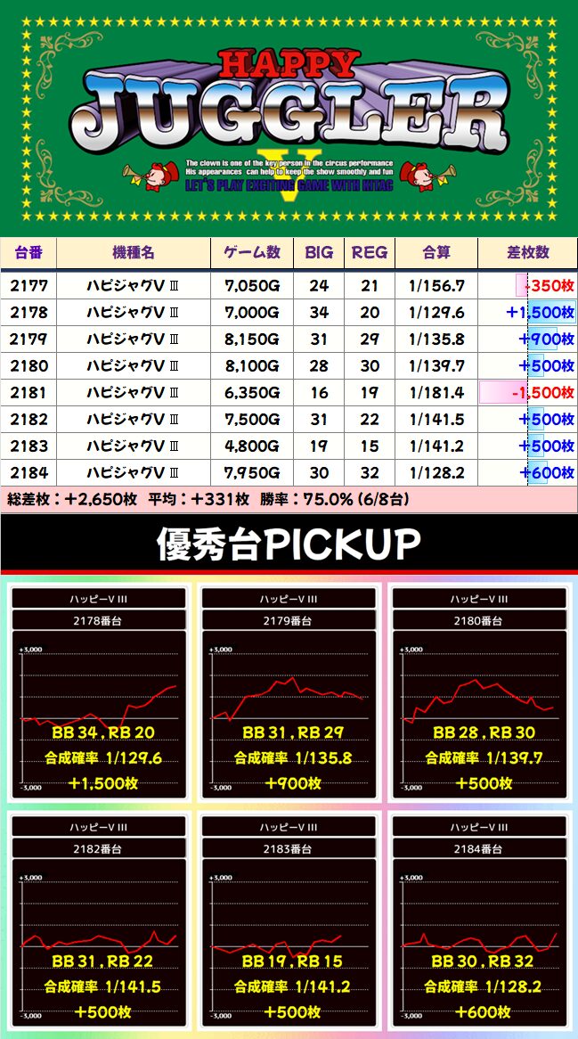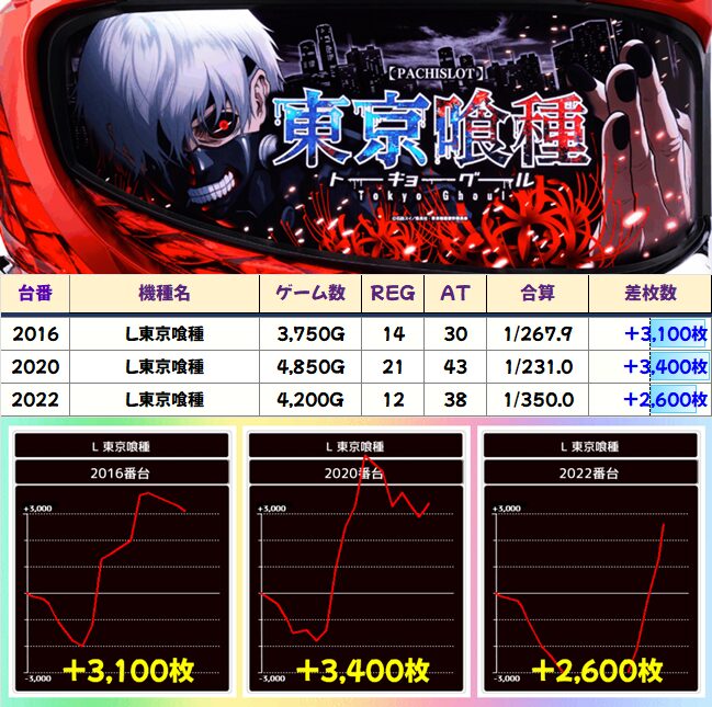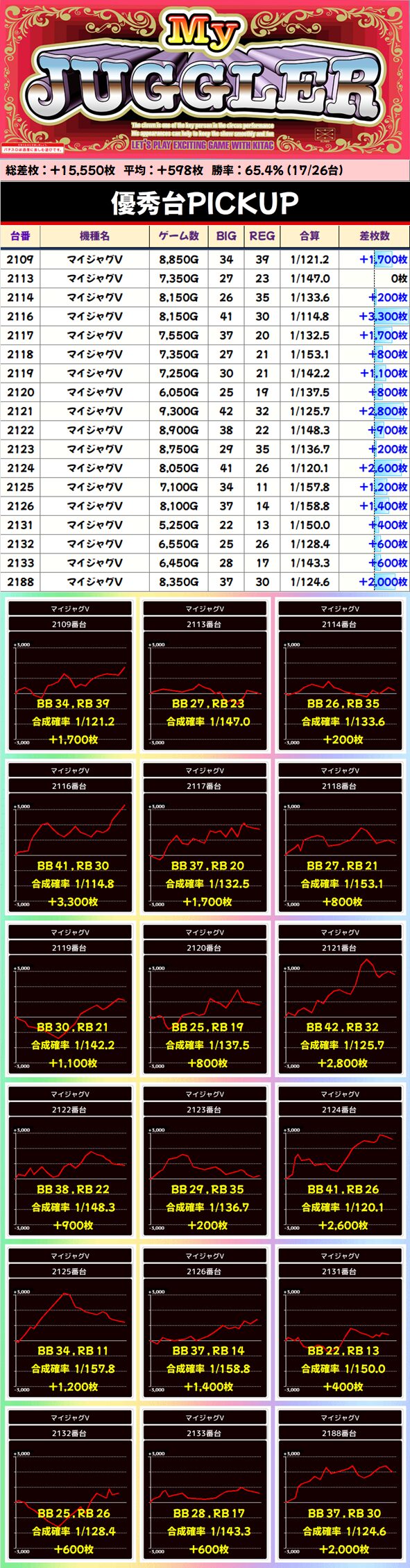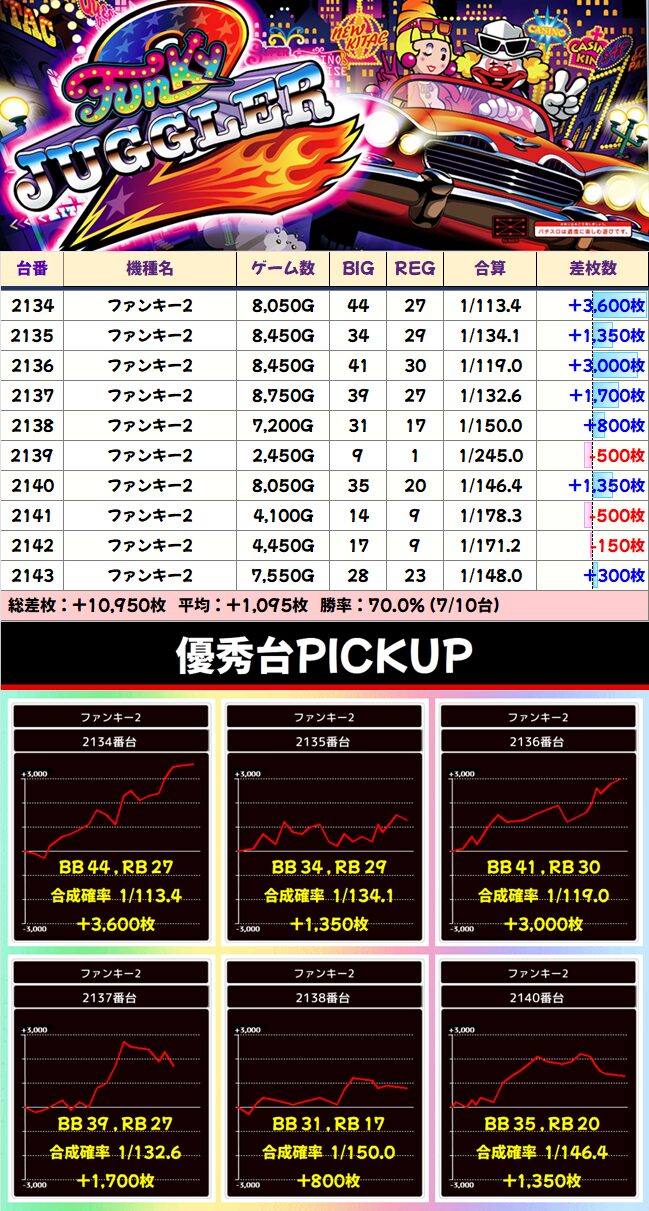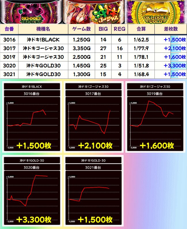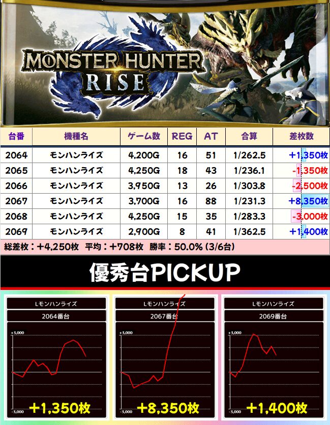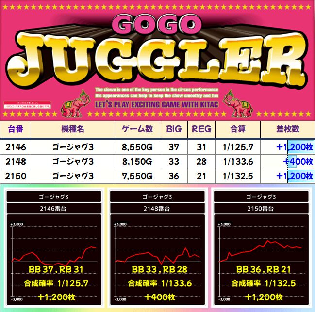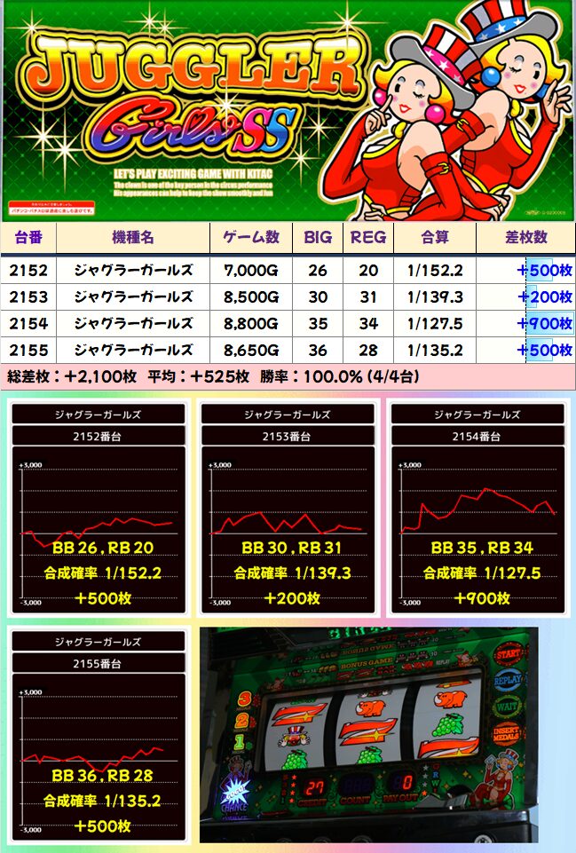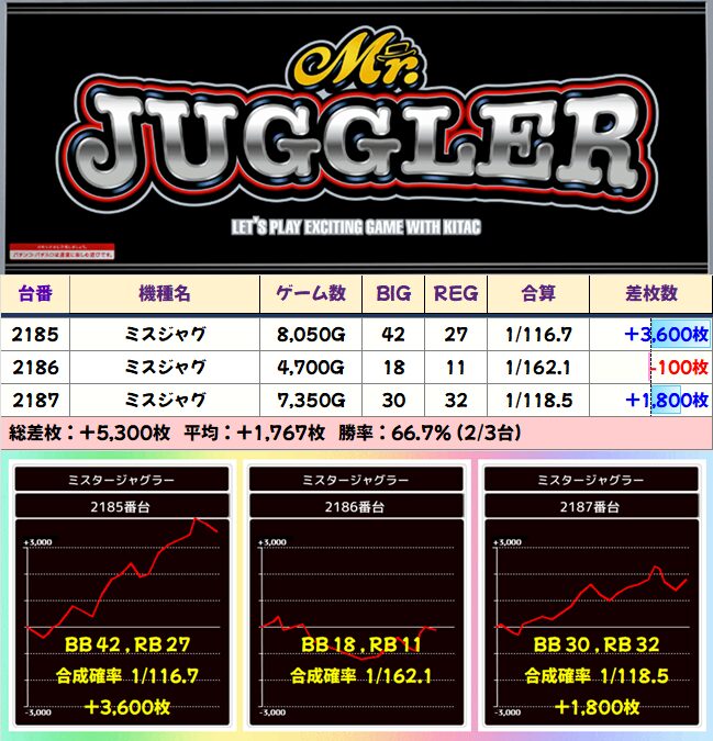 今回のジャグも1台平均差枚が+487枚と優秀な結果を収めました。今回は特に3台設置のミスジャグが強く、1台あたりの平均差枚もかなり多いです。