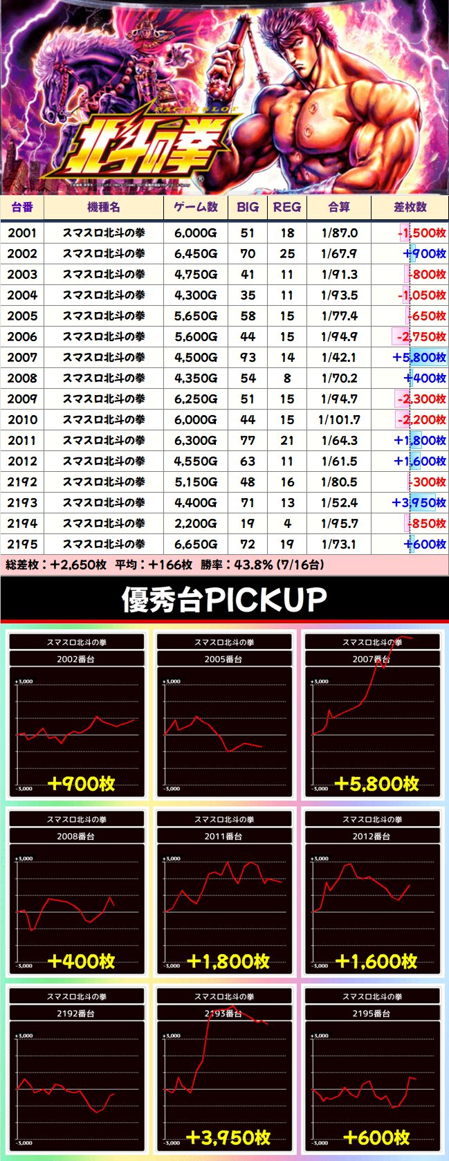 北斗特有のジワジワ伸びるグラフは上記の台。2007番台はBB関連の展開に恵まれて軽快に伸ばしていってます。