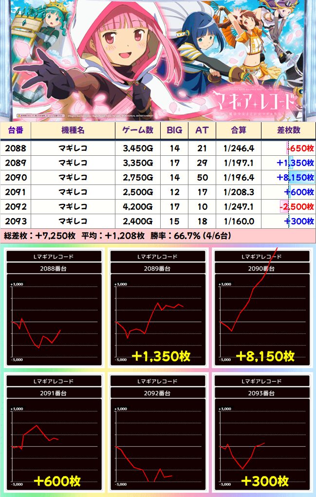 ドッペルにたどり着くと豹変するのがマギレコ。2090番台がまさにそれで、他の台が頑張っているなかで一気にブチ抜くこのグラフ…エグいです。