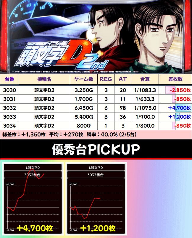 前回、全台系になっていた頭文字D2は今回も仕掛け対象機種の可能性あり。5台設置で残っているので、今後もやはり注目すべきでしょう。