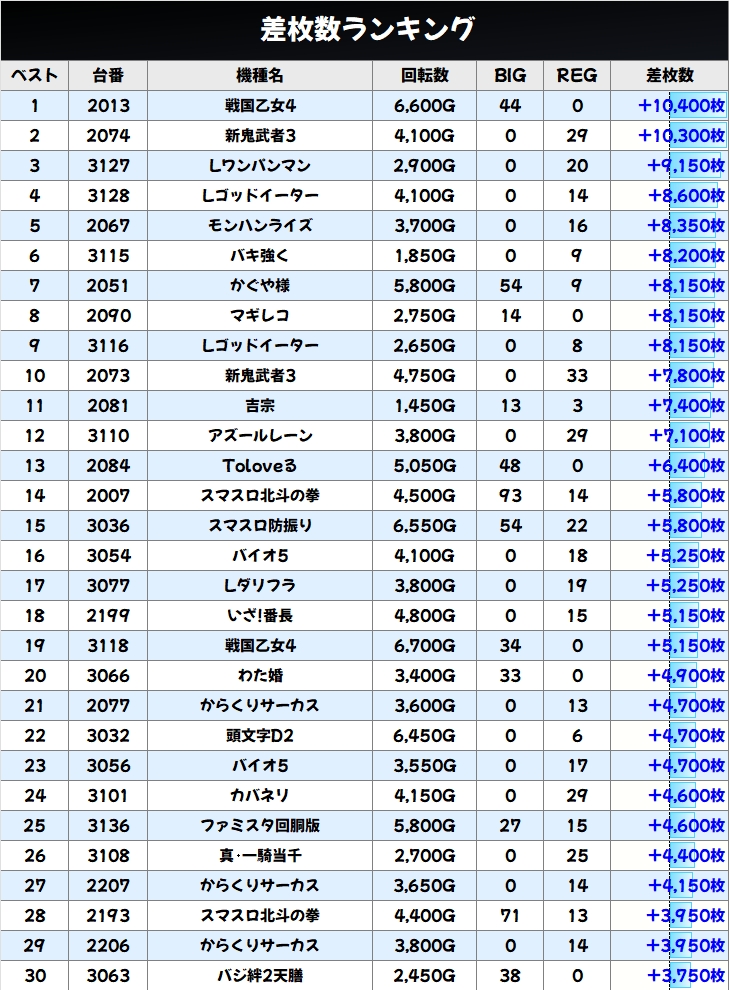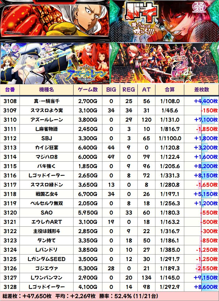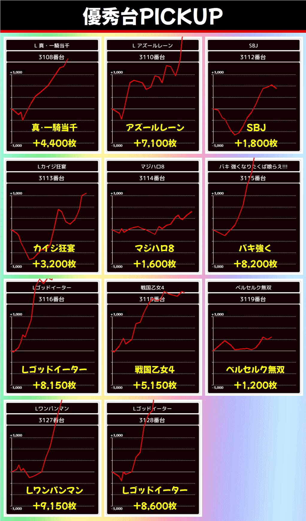 今回も非常に優秀な結果で+12万枚over達成!勝率だけでみると前回と変化ナシ!また、今回特に目立っていたのがバラエティコーナー(3108-3128番台)でした。なんと1台の平均差枚が+2000枚overです!なので、今回は優秀台だけでなく、バラエティ全体でそれを掲載しております!