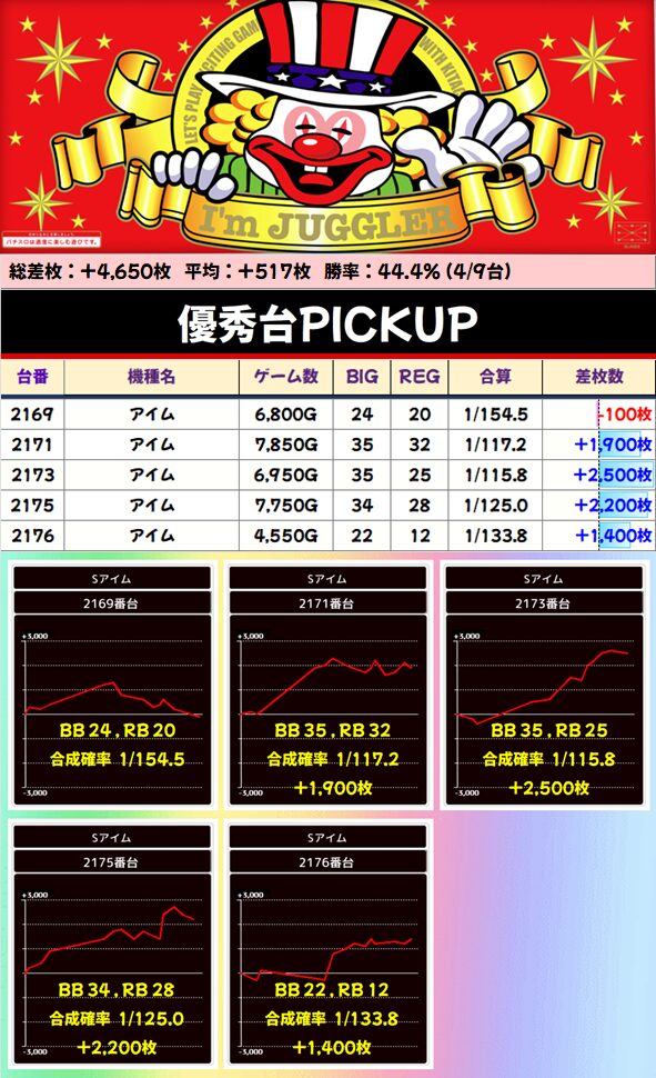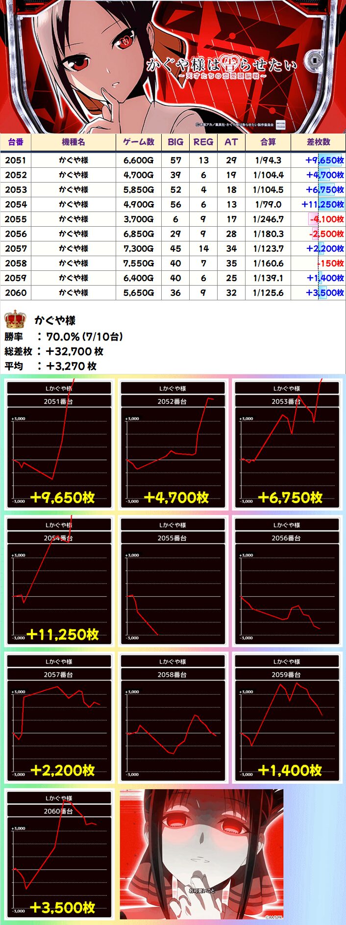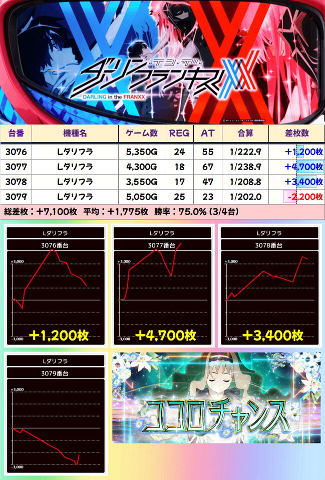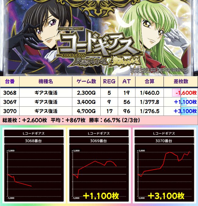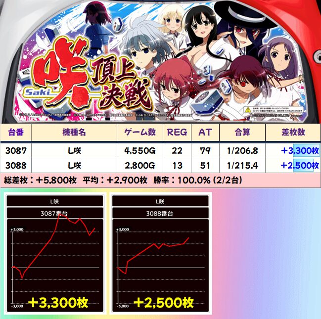 マイナスで終わっている台も稼働に対して極端なマイナスがなく、全台系とみて間違いなさそうです。上位ATにたどり着いた台の破壊力がすさまじいですね…。
