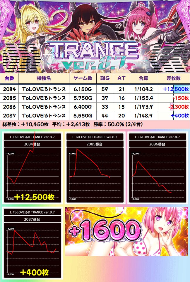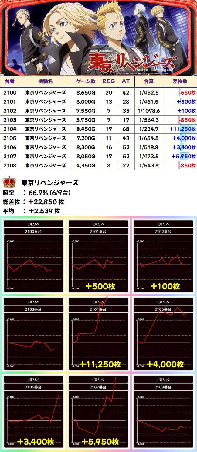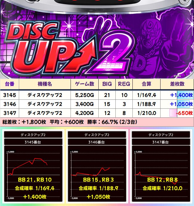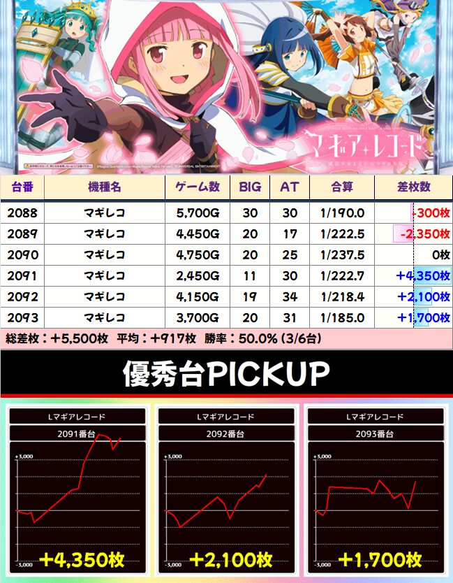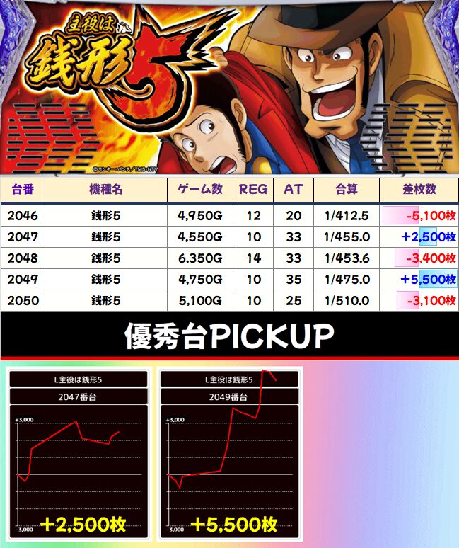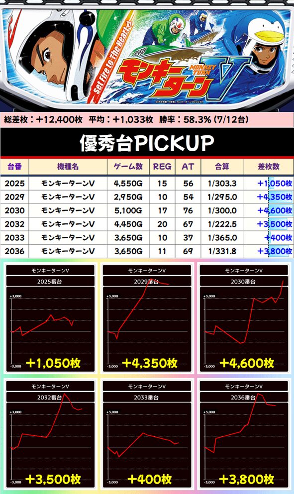 マイナスで終わっている台も稼働に対して極端なマイナスがなく、全台系とみて間違いなさそうです。上位ATにたどり着いた台の破壊力がすさまじいですね…。