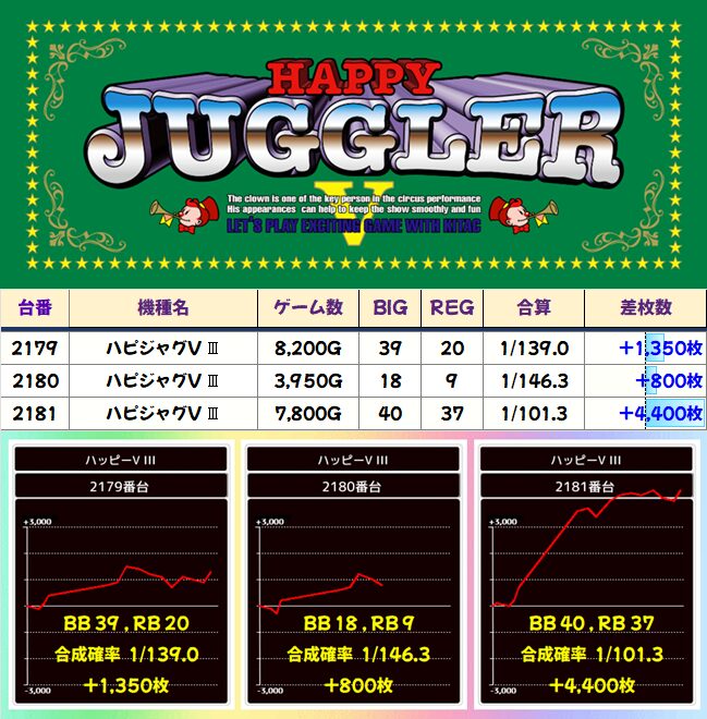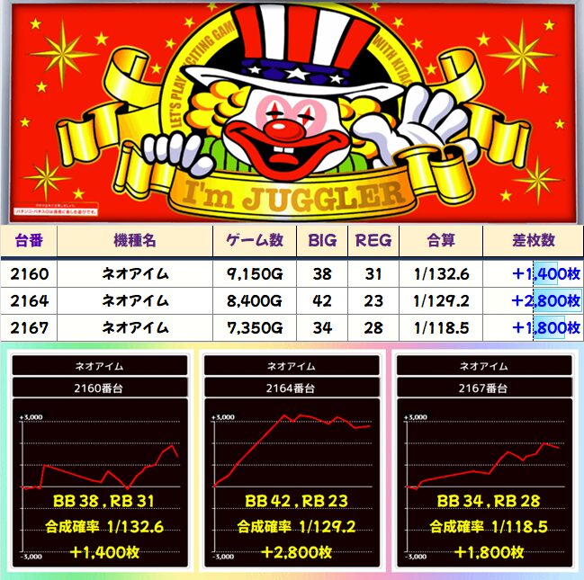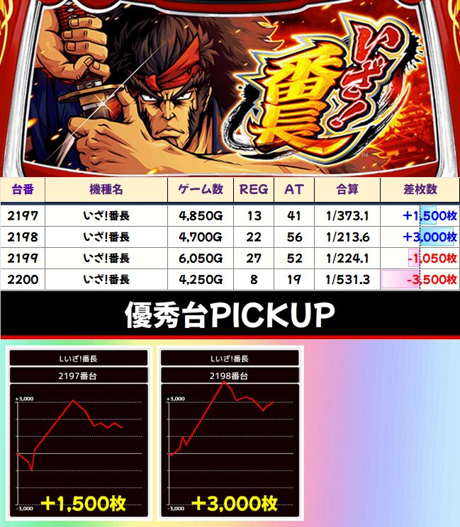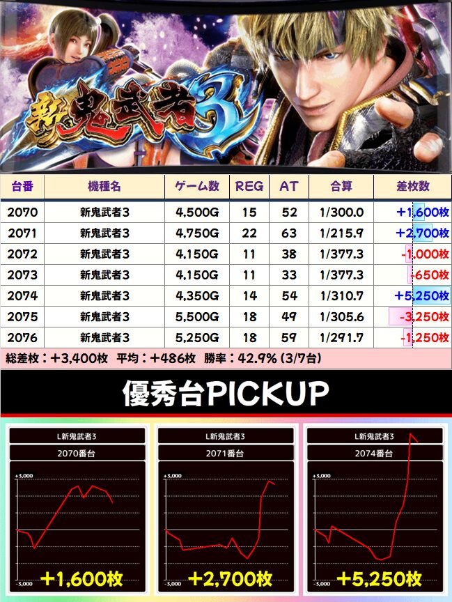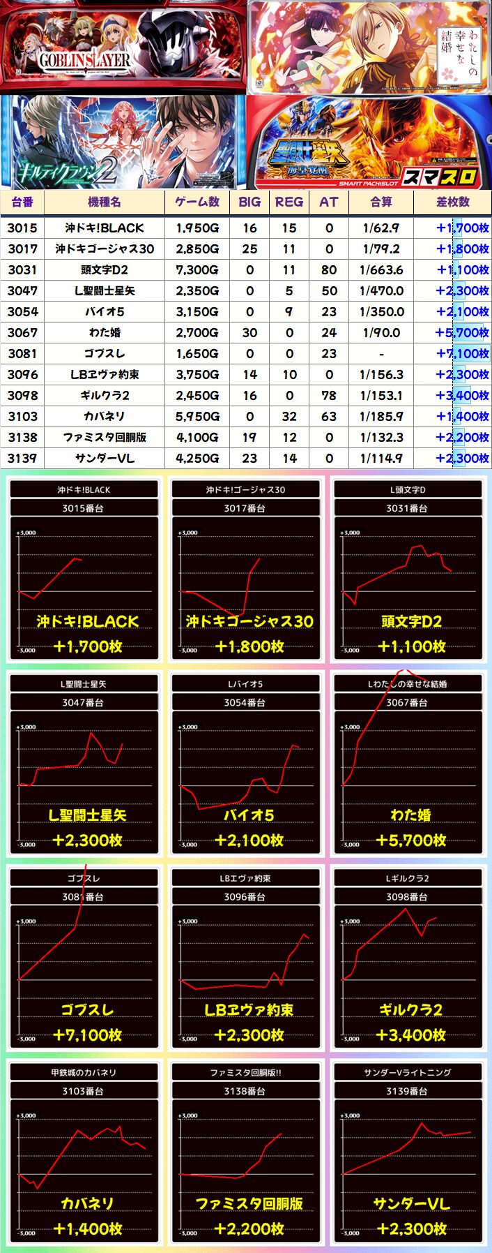 3000枚overが4台あります。上位ATによる一撃と思われますが、その前後の挙動も悪くなさそうですね。