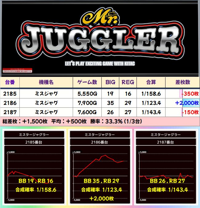 初代の代わりにトランスが4台になってからの初日曜でコレ。マイナスの台はよくみると最初に一撃を当ててから粘ってますね。稼働も荒波台なのにすこぶる高いです。