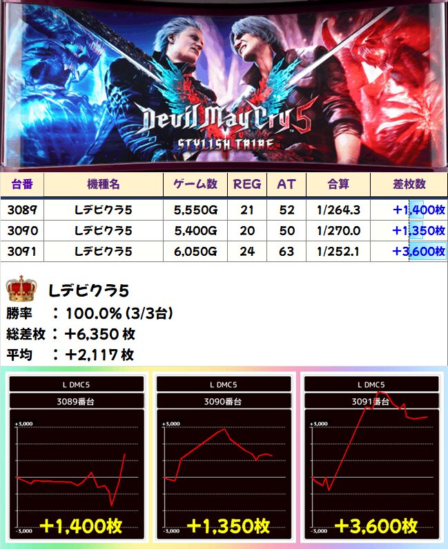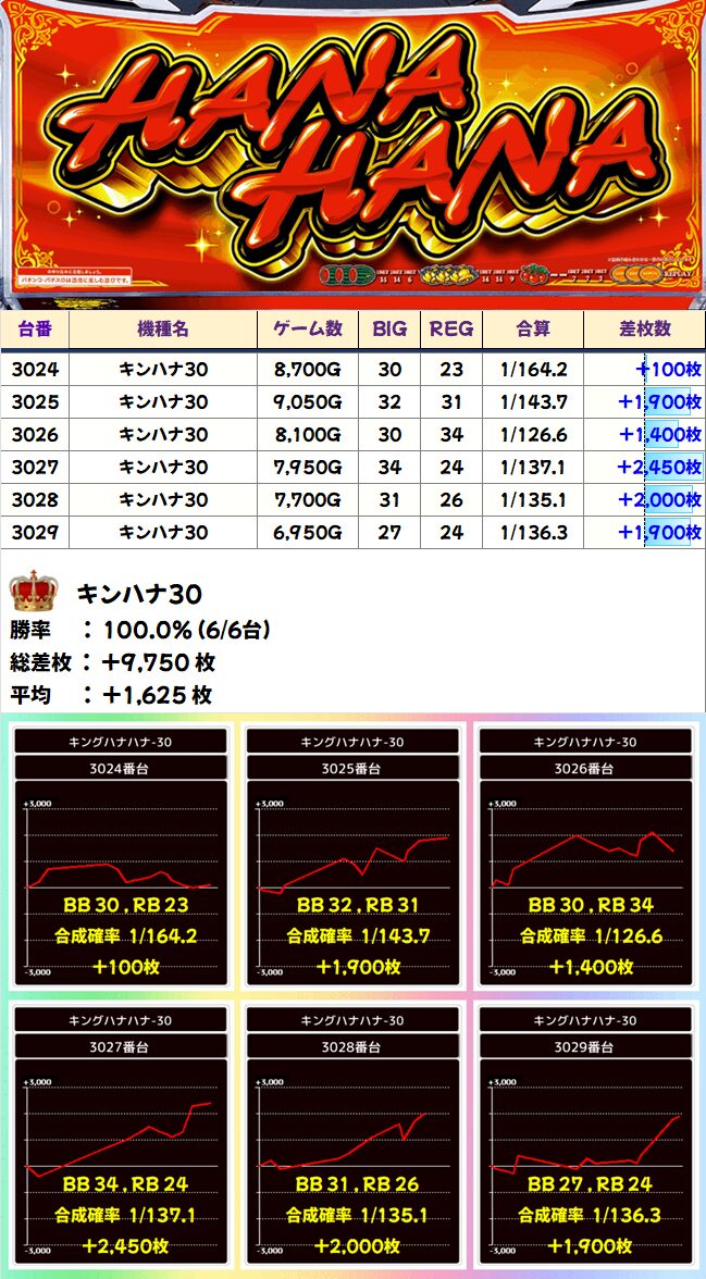 仕掛け対象機種になる傾向が高いキンハナ30、今回はおそらく全台系か。それぐらい派手な結果になっています。また、3台設置のデビクラ5や、2台設置のL咲も全台プラス差枚となっているようです!