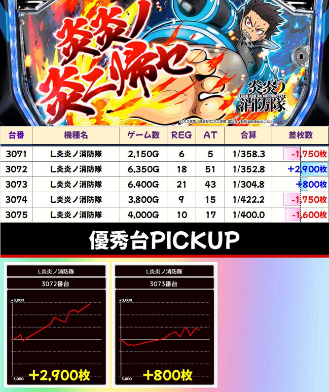 2台ほど6000G超でしっかり粘られています。通常時の十字目からボーナスにつながる傾向で初当りを稼げたか?REGからの炎炎激闘当選も良好。