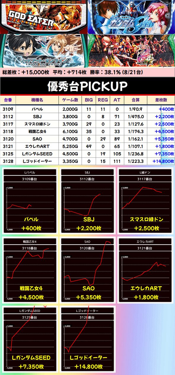 ゴッドイーターがTOP2の出玉を達成。ガンダムSEEDも上位到達による破壊力で大きく出しました。SAOも途中から台が一変したような出玉挙動!