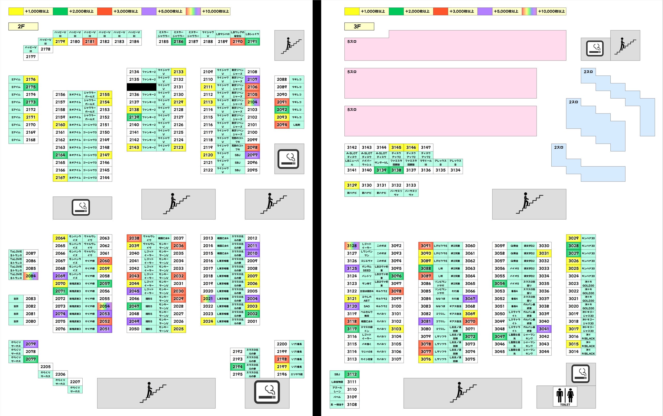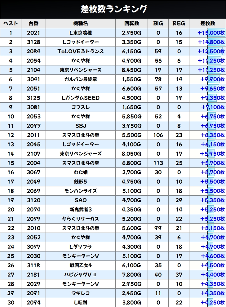 万枚は5台ですが、ガルパンは実質万枚みたいなモノですね。そしてかぐや様が強い!上位30台のうち4台も入ってきており、仕掛けられた時のスゴさを物語っています。