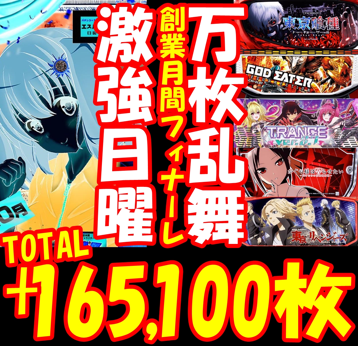 創業月間最後の日曜日、最後までトップスピードで駆け抜けて、第1日曜日の出玉記録を超えていきました!今回、2Fに派手な仕掛けが多かった影響から万枚超が5台も出ています!バラティからも万枚が…?