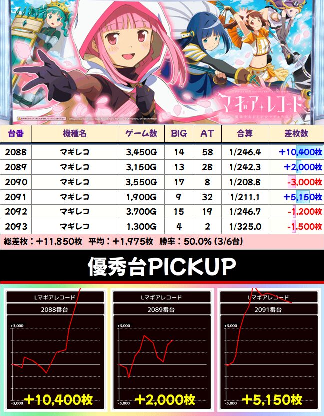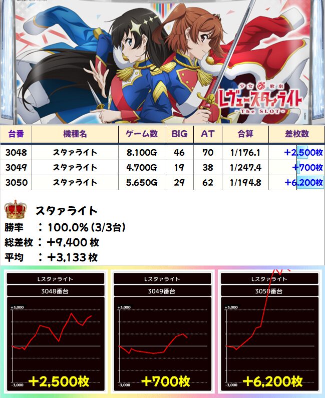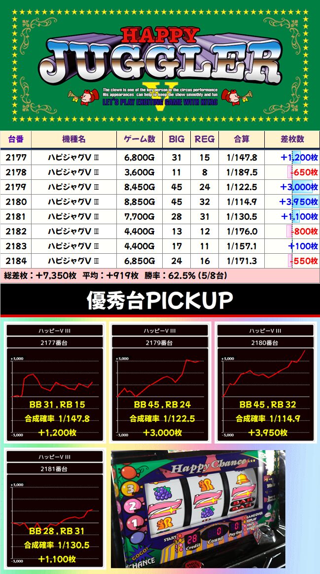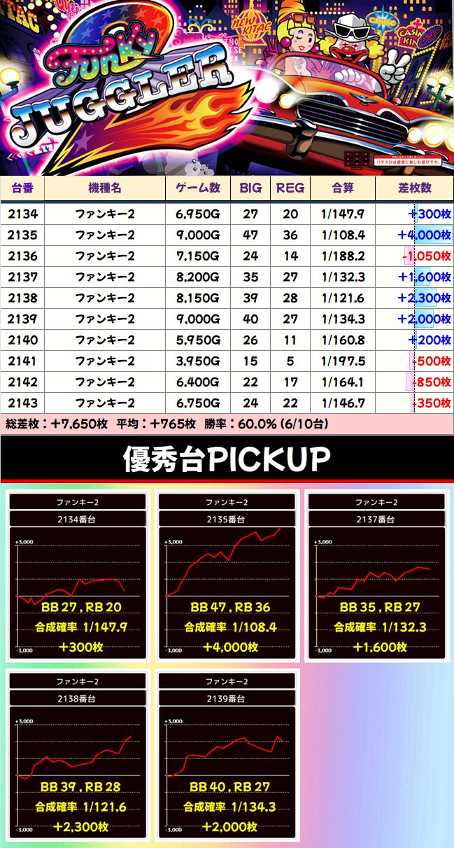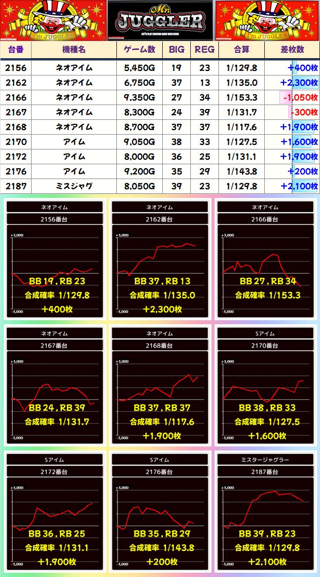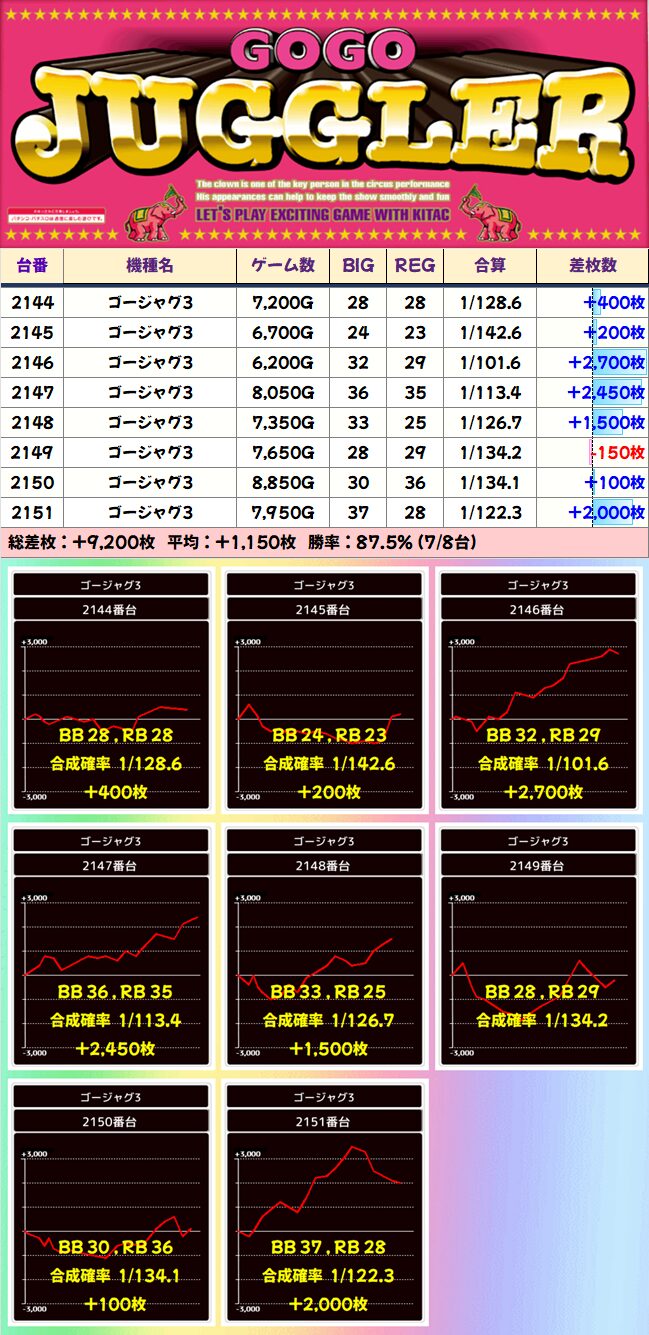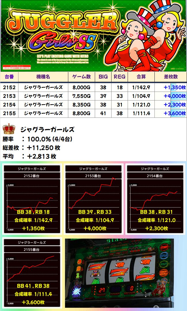 今回は4台設置のジャグラーガールズがバリバリの安定挙動で間違いなく全台系とみてよいでしょう。他では8~10台設置のジャグに1/2系が多いので、それらの機種も狙い目となりそうですね!