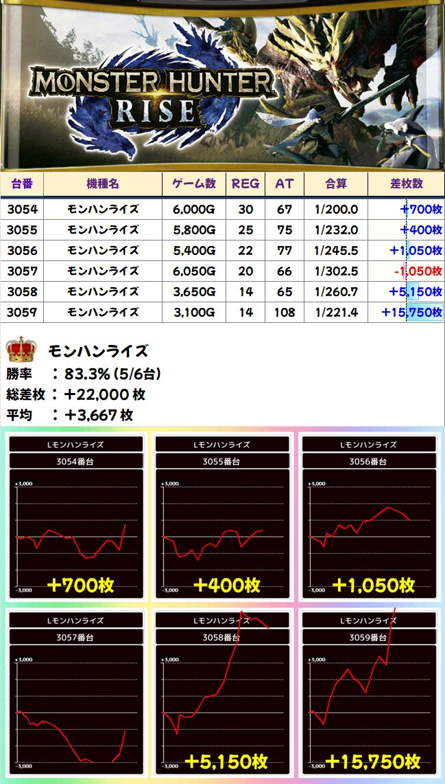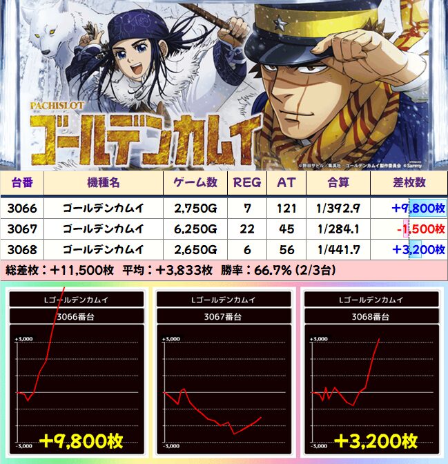 11/4の新台入替で2Fにあった機種が3Fに3台設置となる大型の配置変更がありました。また、復活導入としてゴールデンカムイもあり、そこは強かったようです!モンハンも移動して3Fにあり、それがサンちゃんポストの示唆機種…ということは、狙って仕掛けてきた可能性アリ?(移動後に過去最高データ更新が狙いか?)