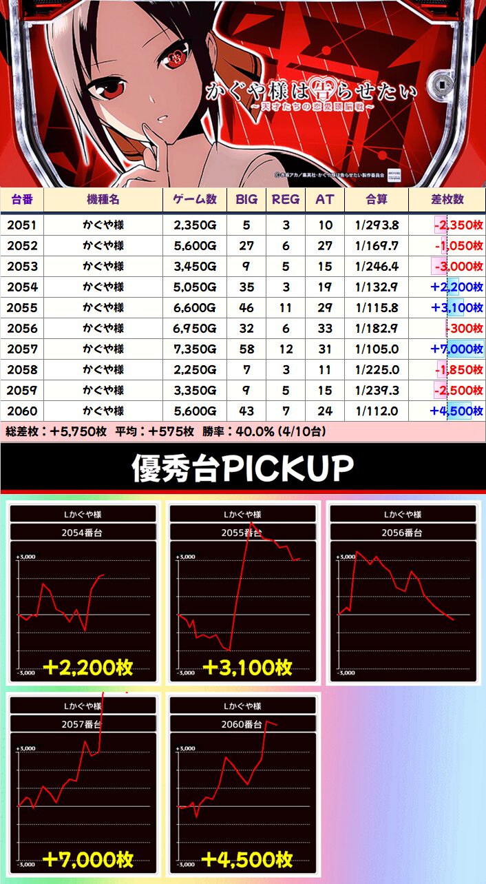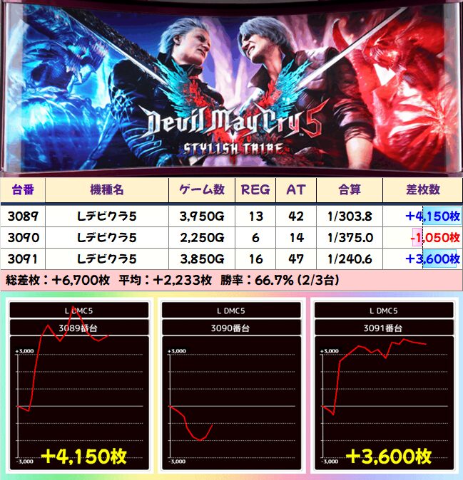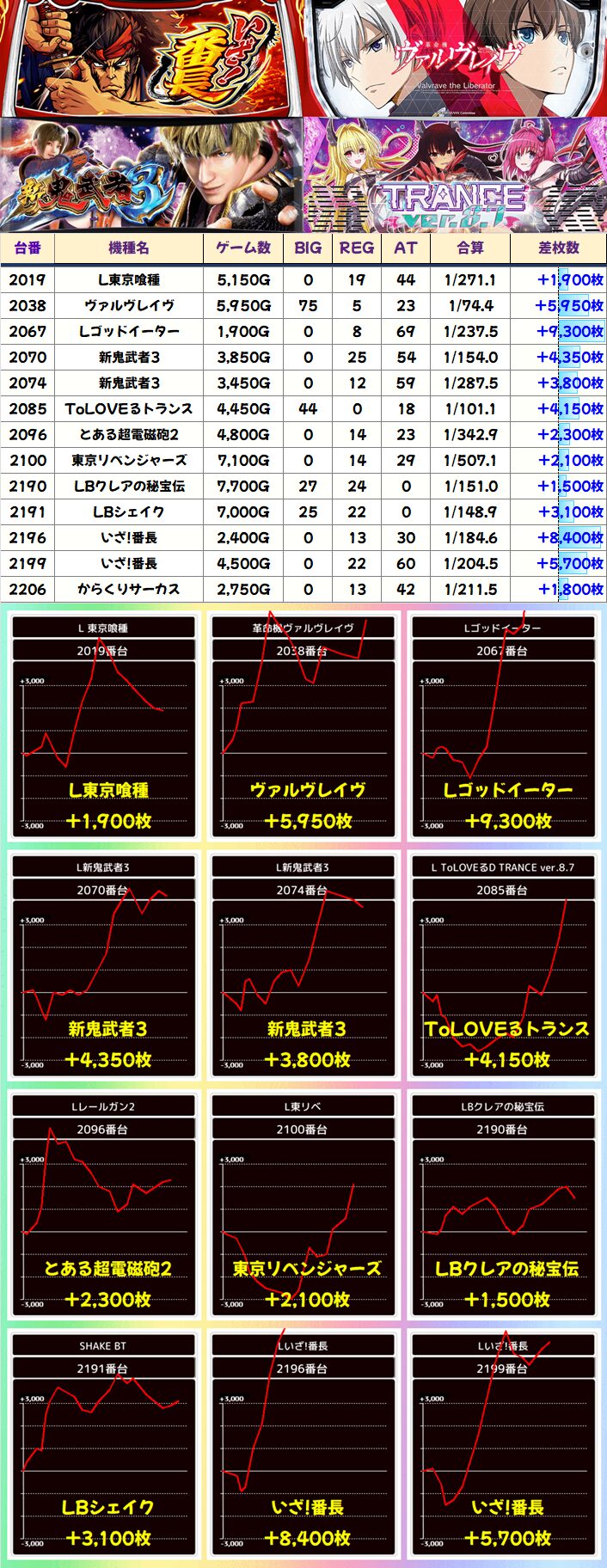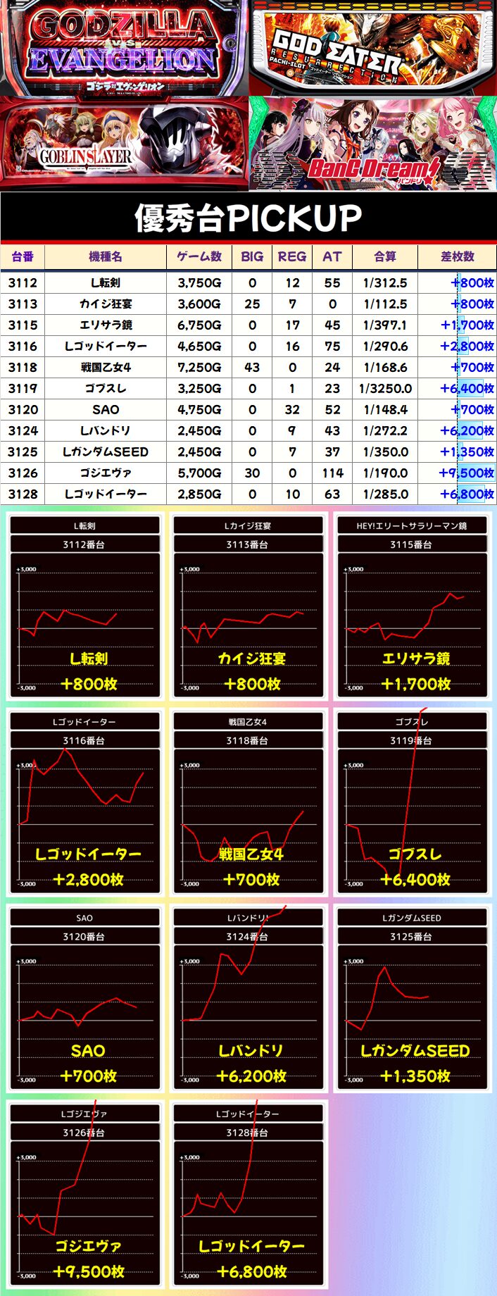 ゴジエヴァが上位ATの破壊力をみせつけました。あとはゴッドイーターが2台とも出玉が噴いており、バンドリの二撃や、ゴブスレの一撃必殺が派手です。