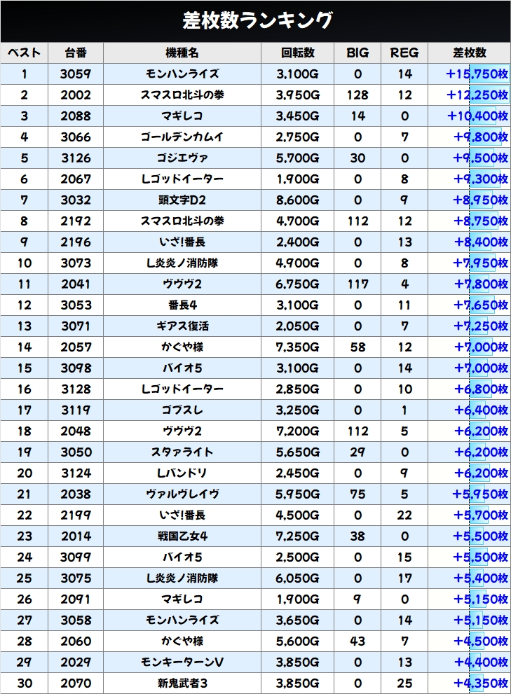 REG回数が先行している台も掲載しています。REGが優秀ならもちろん追う契機にはなるのですが、BIGがないと厳しいのは否めませんね…。