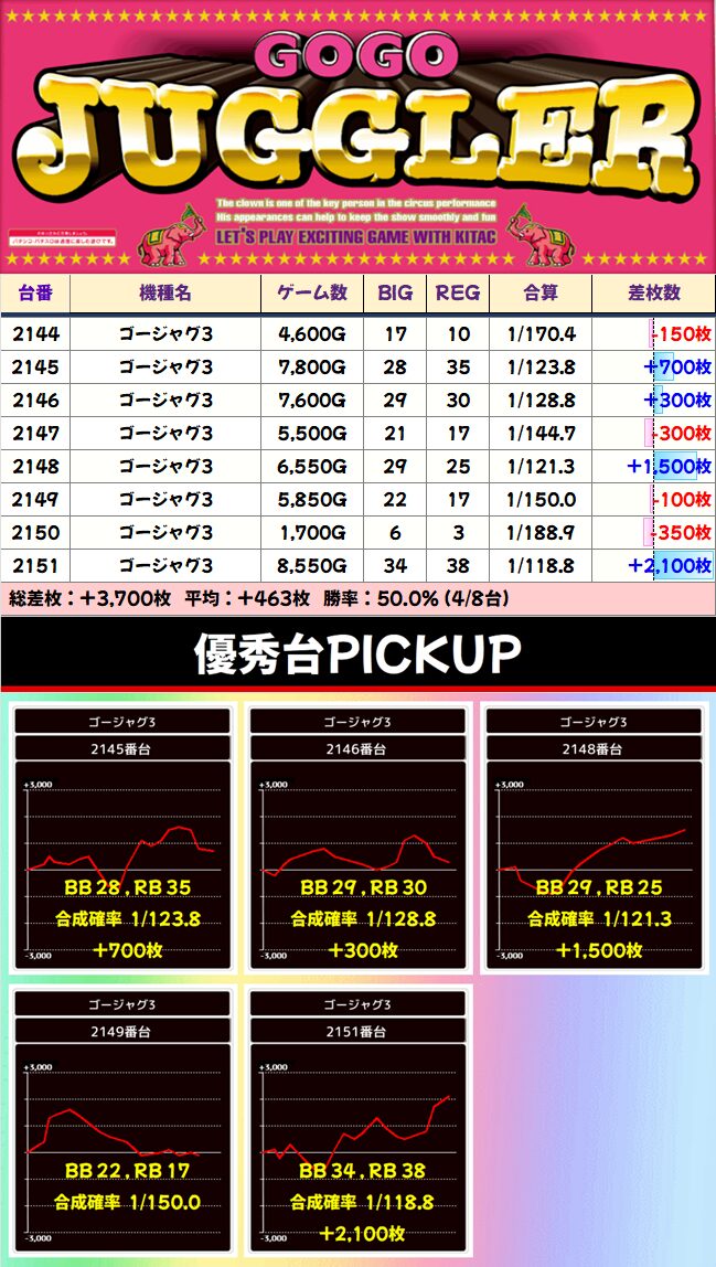 今回は1/2系と思われる挙動が多い印象。機種での投入率でいえばゴージャグ・ハピジャグ・ファンキー2はしっかりチェックすべきか?
