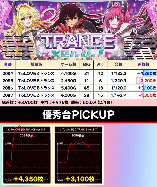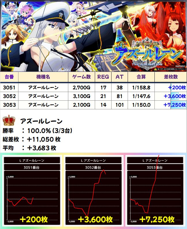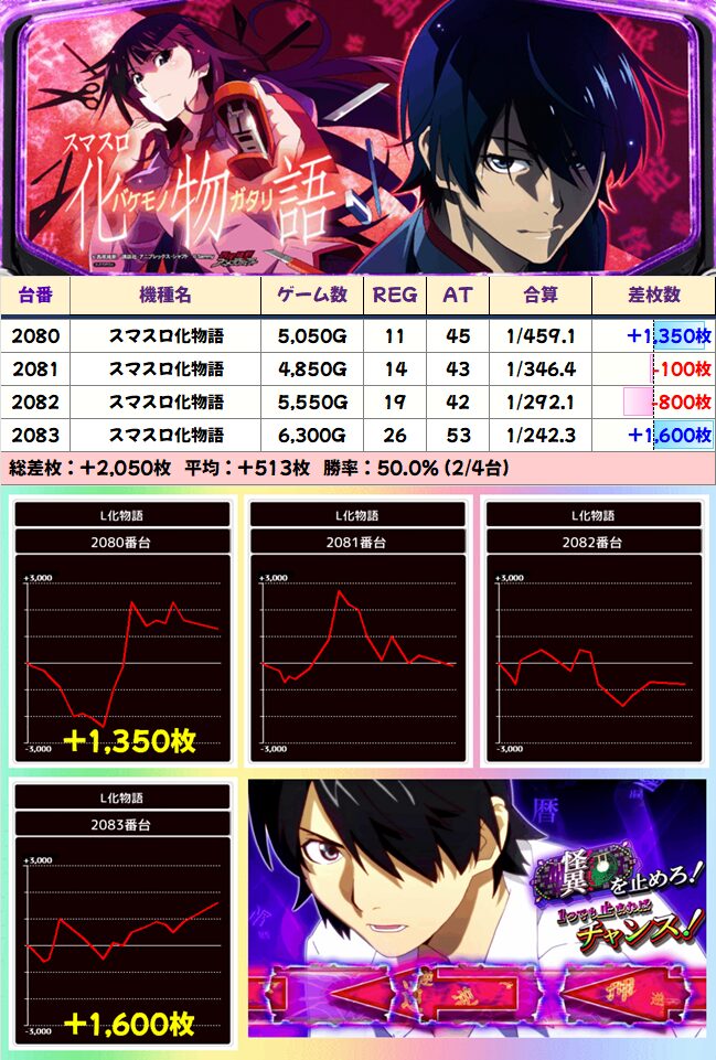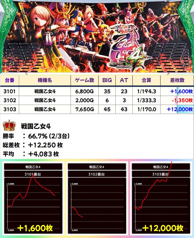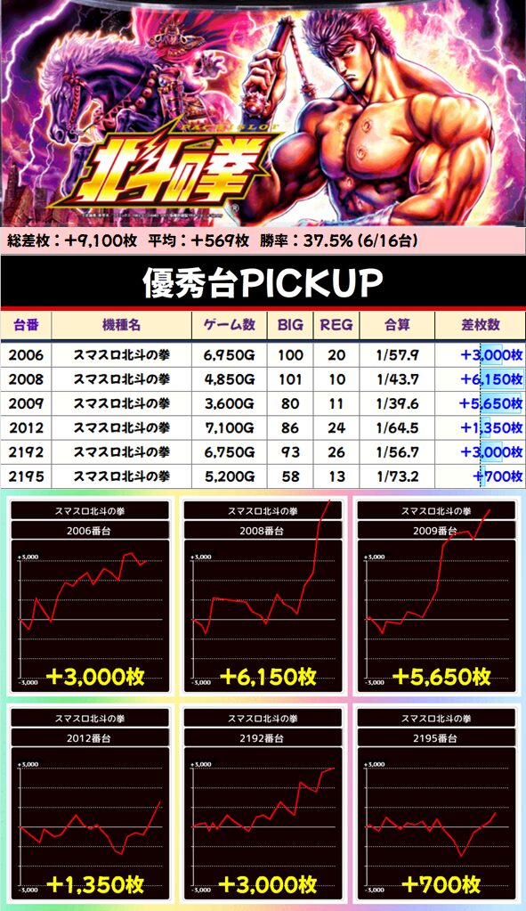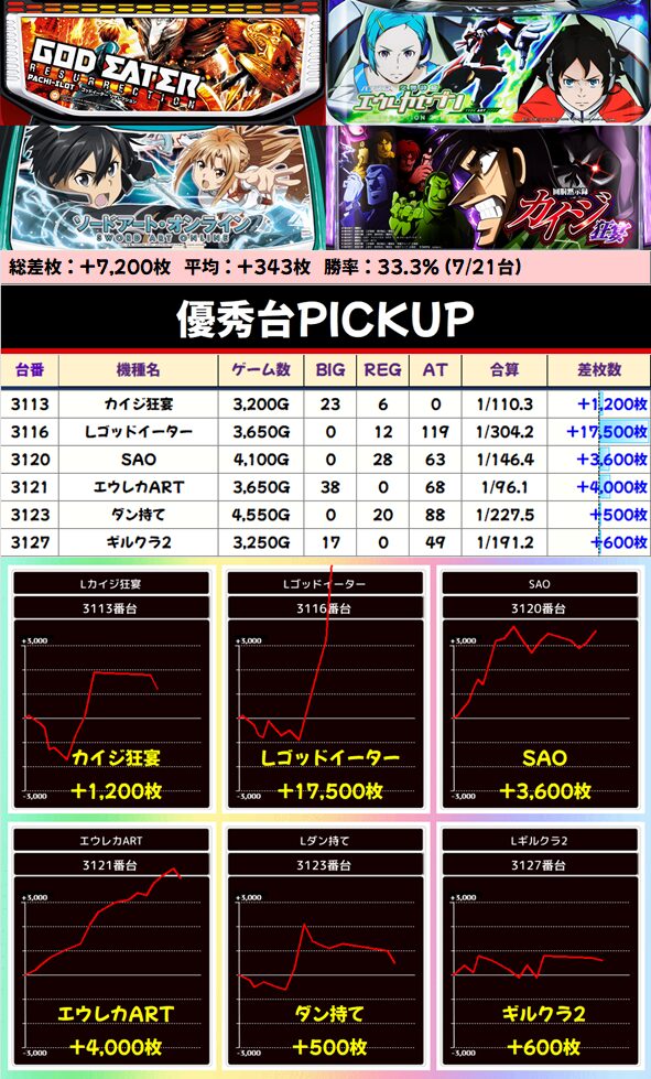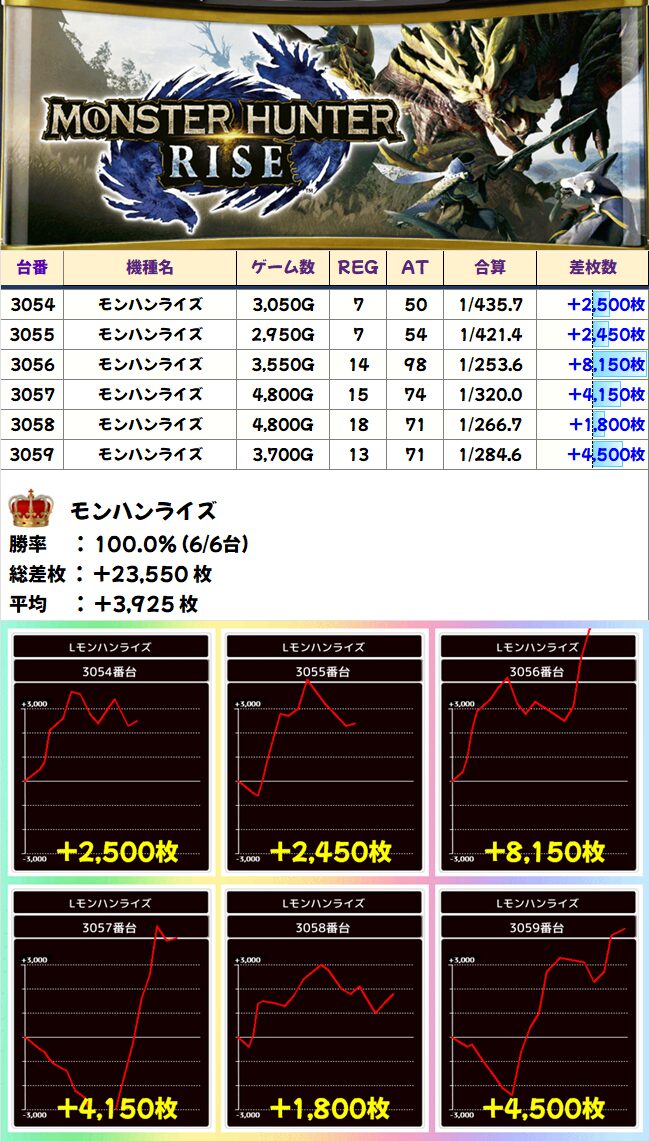 展開次第で激変する台で、見事に6台すべてプラス差枚で終了。3057番台は-4000枚からのすさまじいドラマを見せています。