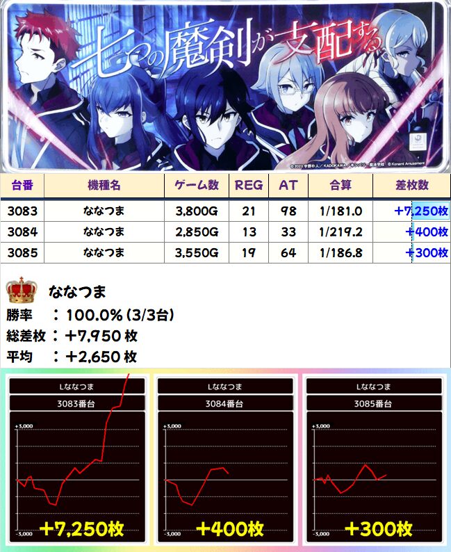 通常時の初当りをしっかりとれるのがななつまの高設定。3083番台は一撃はなく積み重ねて最後に特大出玉につながりました。