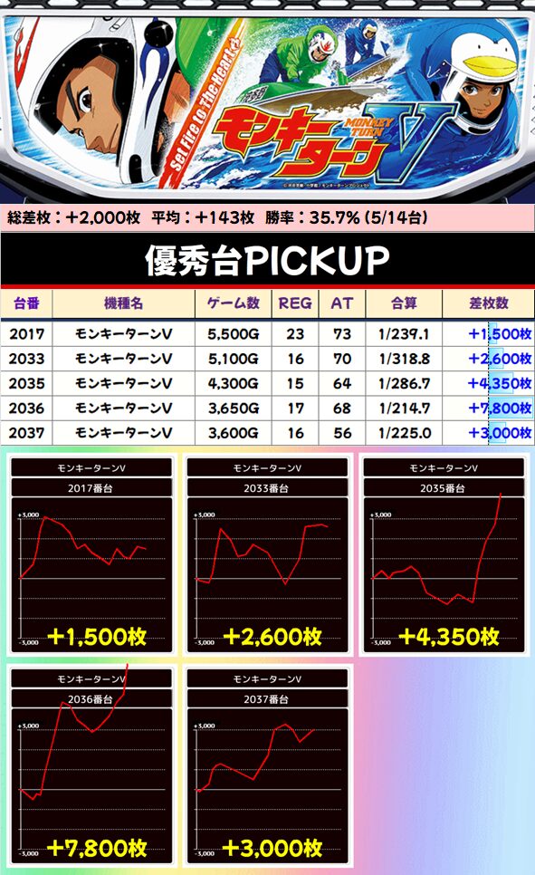 1/2系といかずとも、1/3あたりの配分にはなっている機種が多いのでは…と思わせるのが今週のオススメ機種。モンキーVもしっかり初当りのREGがとれてます。