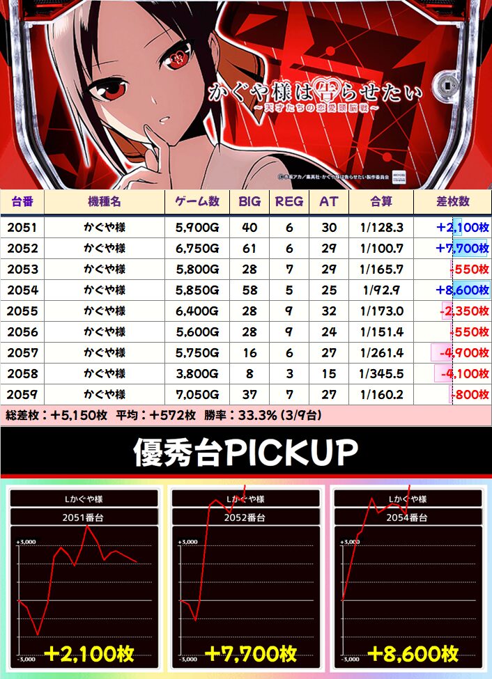 渋谷本館の日曜の強さを象徴する結果となりました!なんの変哲もない休日の日曜日に+16万枚overという都内TOPクラスの出玉です。また、後程まとめておりますが、2Fのオススメ機種は高配分が多く見られたので、やはり日曜はさらに狙い目となるのではないでしょうか?