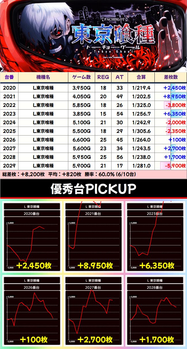 オススメ機種の中でも現在人気NO.1と言える東京喰種。しっかり高設定を投入してきました。配分的にみてニブイチではないかと思われます。
