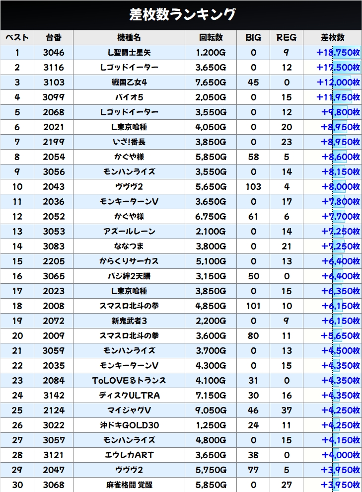 30位のうち14台が3Fの機種になっています。これが12/21の3Fの強さを物語っているのではないでしょうか。3台設置の機種に仕掛けが多い、渋谷本館×日曜の傾向を表したランキングですね。
