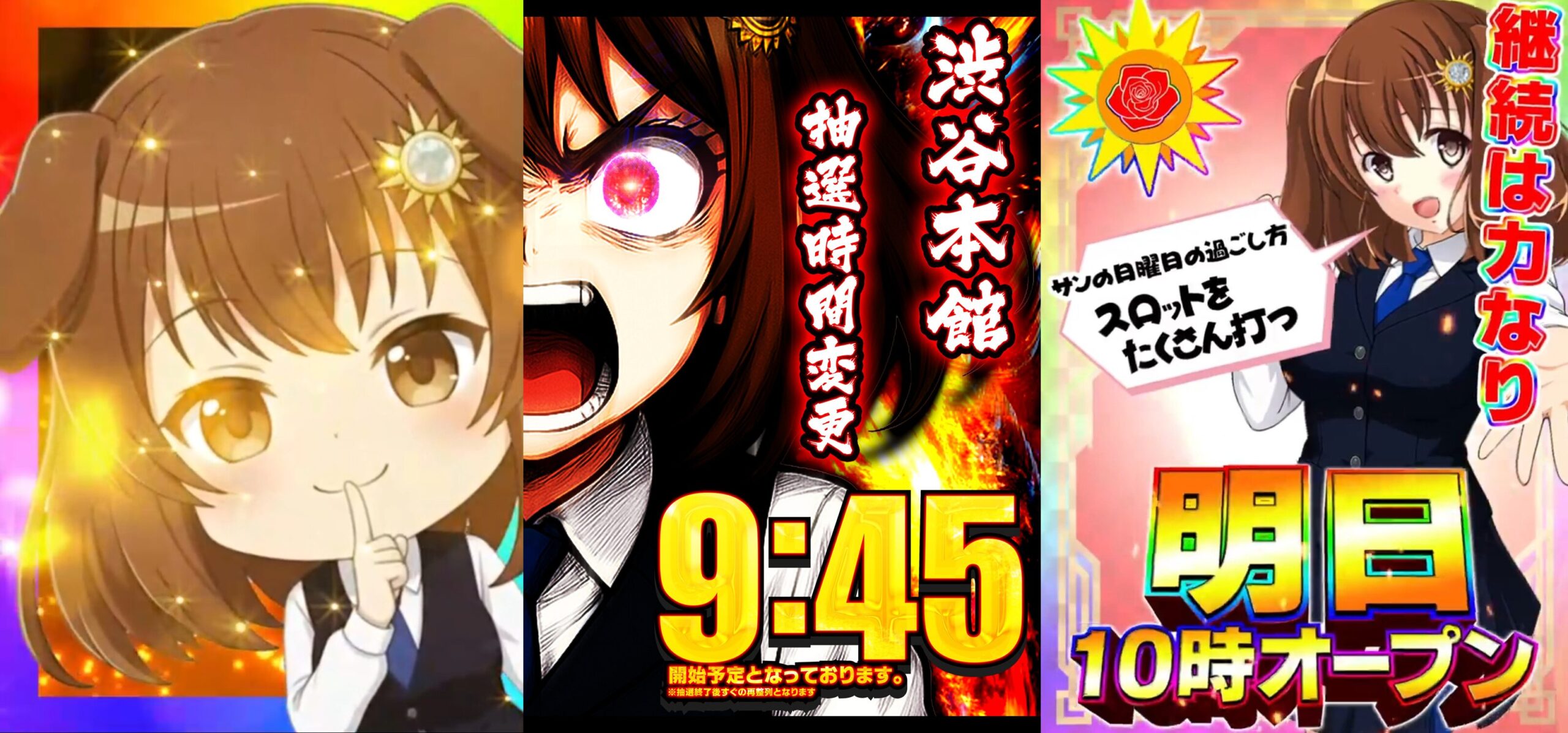 抽選時間が通常の9:47から9:45への変更…これは昨年だと11/30に行われたものと一緒であり、その日は渋谷本館の日曜でも過去最高レベルの出玉(総差枚…+258,000枚 、1台平均…+766枚)を叩き出しています!