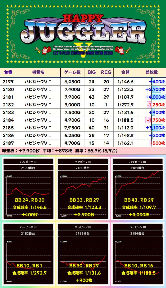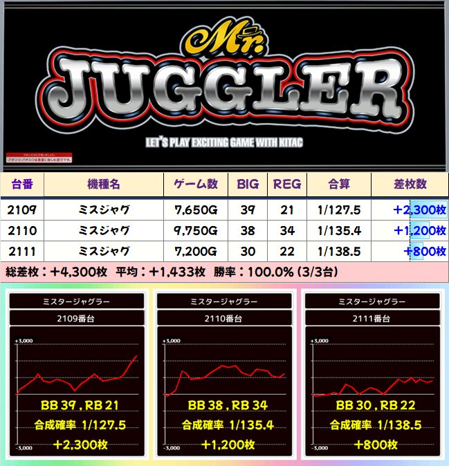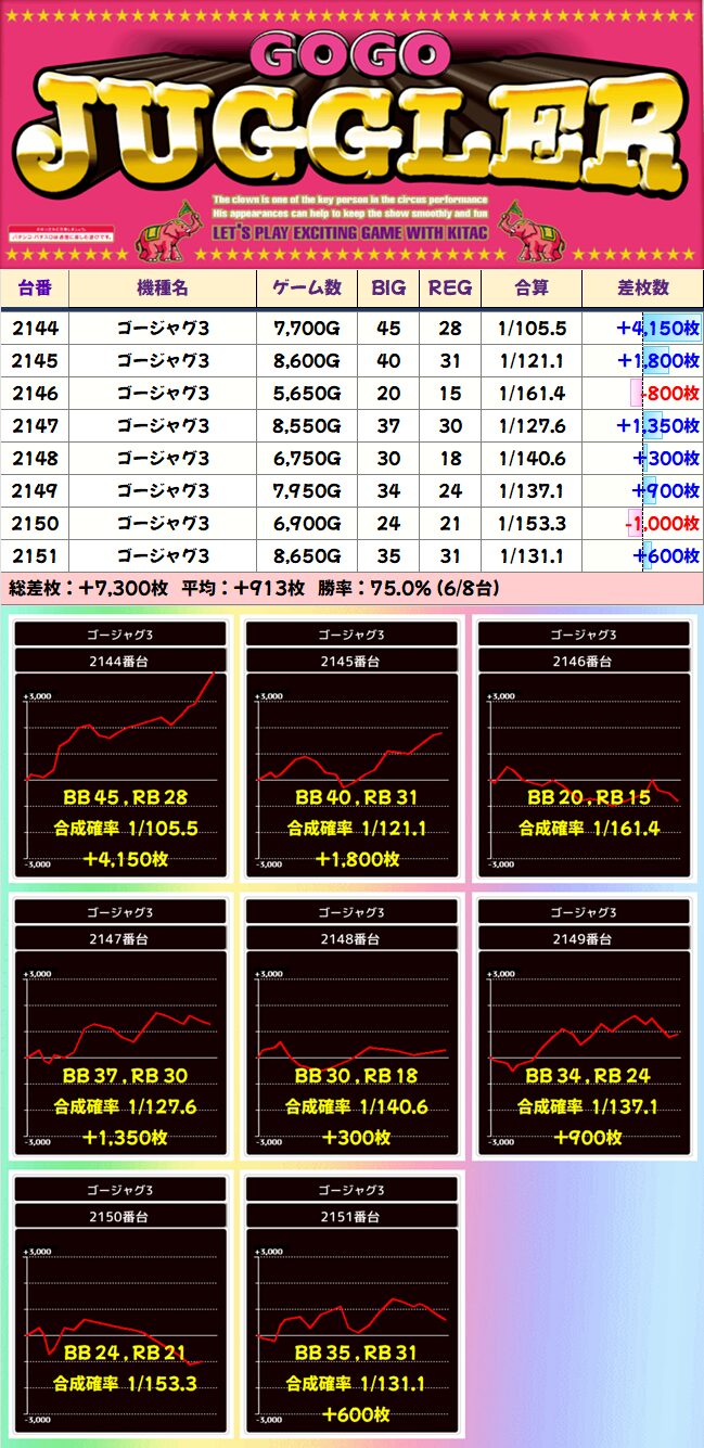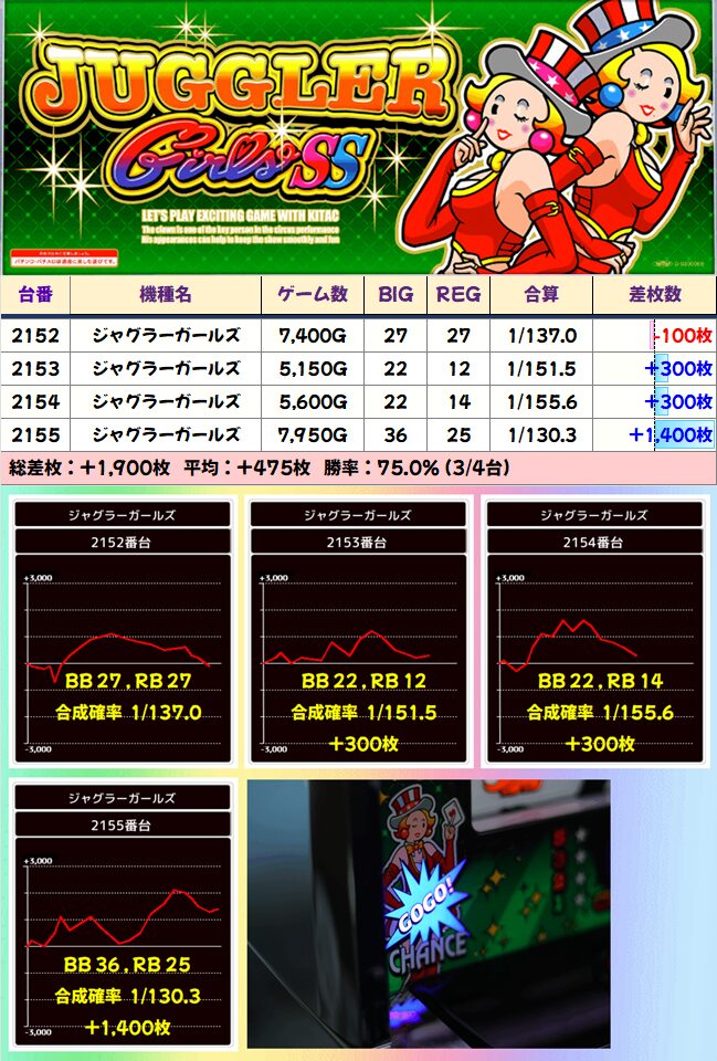 今回全台系と思われるのはミスジャグで、ほかは1/2系の配分と思われるジャグだらけという結果になりました。中押しによる小役狙いが強いぶんだけ、ミスジャグの全台系は安定して1台平均差枚が多くなる傾向にあります。