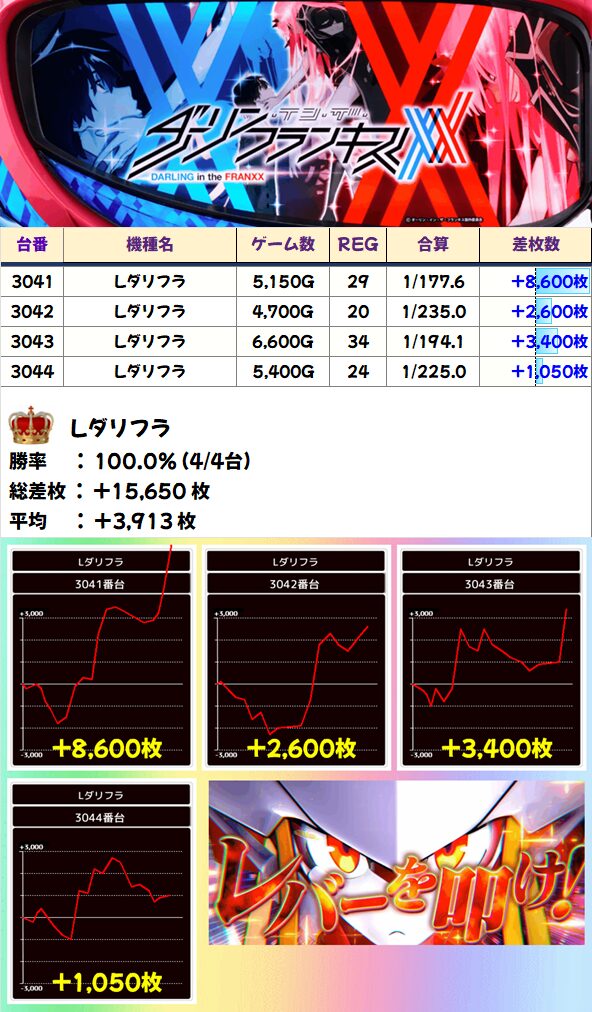 隣のガルパン(下記表)とあわせて、お祭り騒ぎだったダリフラ。全台が伸ばしていく中、MAXXをループさせたと思われる3041番台が8000枚超!