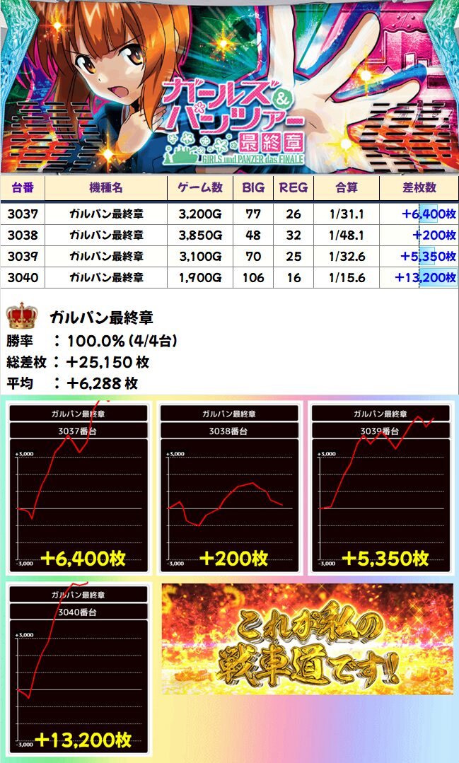 TOP出玉だけでなく5000枚overが2台も出ているシマとなったガルパン。全台系だとしてもここまで派手な出玉にはなかなかないかと…猛者が集まったのか?