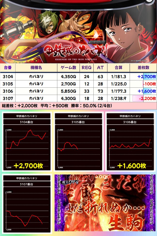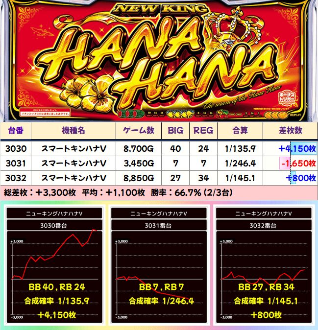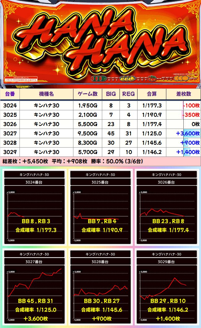 ボーナストリガーでBIG枚数が多くなったキンハナも健闘。やはりBIG300枚は大きく、4000枚overを達成してますね!