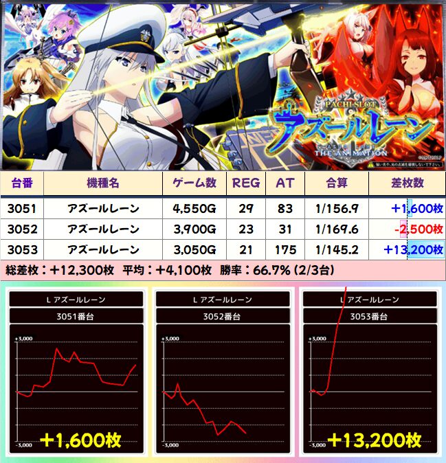 ガルパンと並ぶTOP出玉達成がアズレンです。こういった一撃性も強い台ですが、3051番台のように粘れる挙動はやはり上か?
