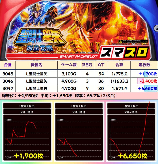 3047番台がREG7回という初当り展開ながら、グラフをみると奈落の底から戻ってます。おそらく枚数でいえば万枚いってますねコレ。