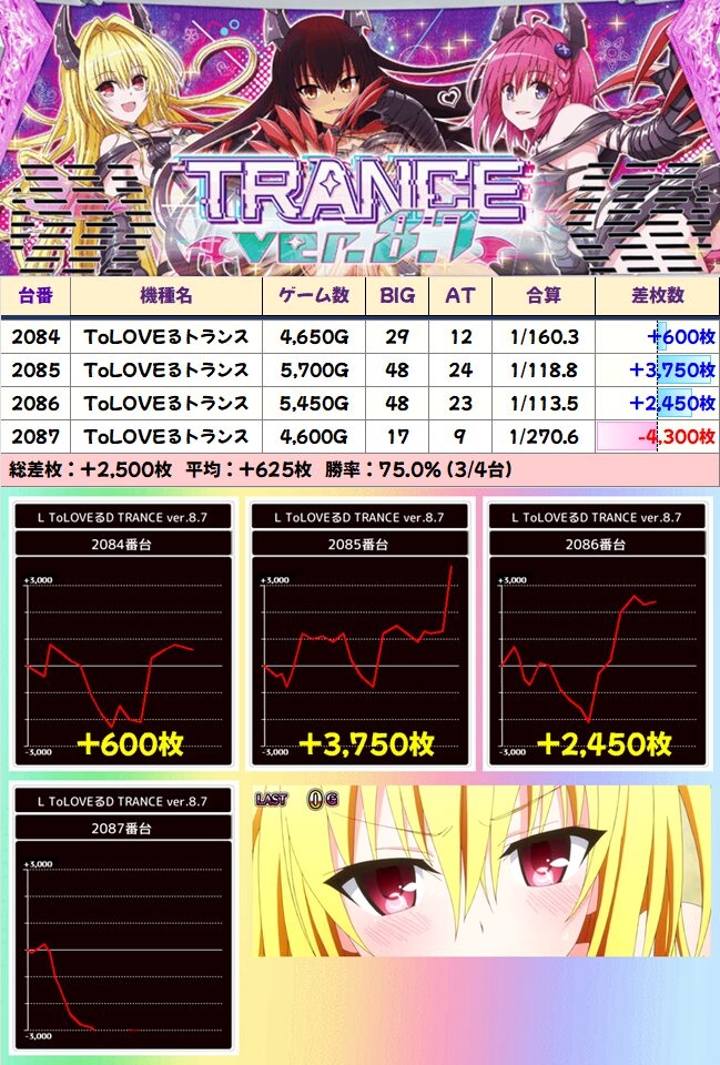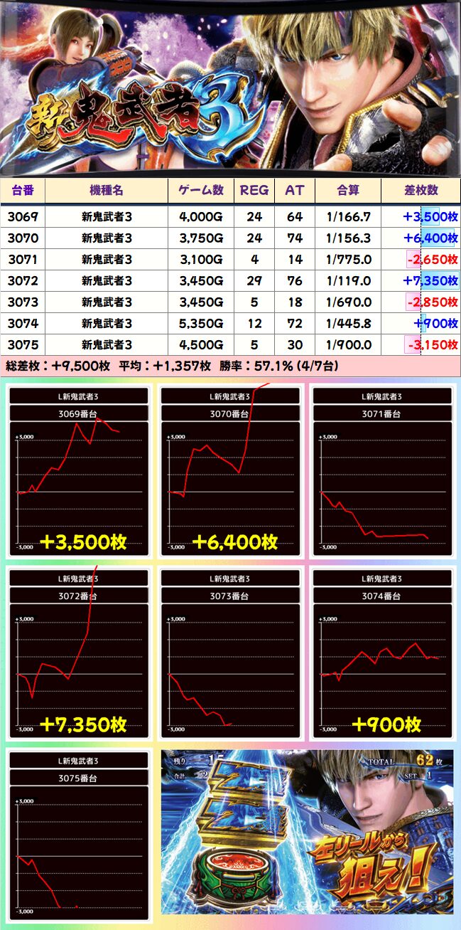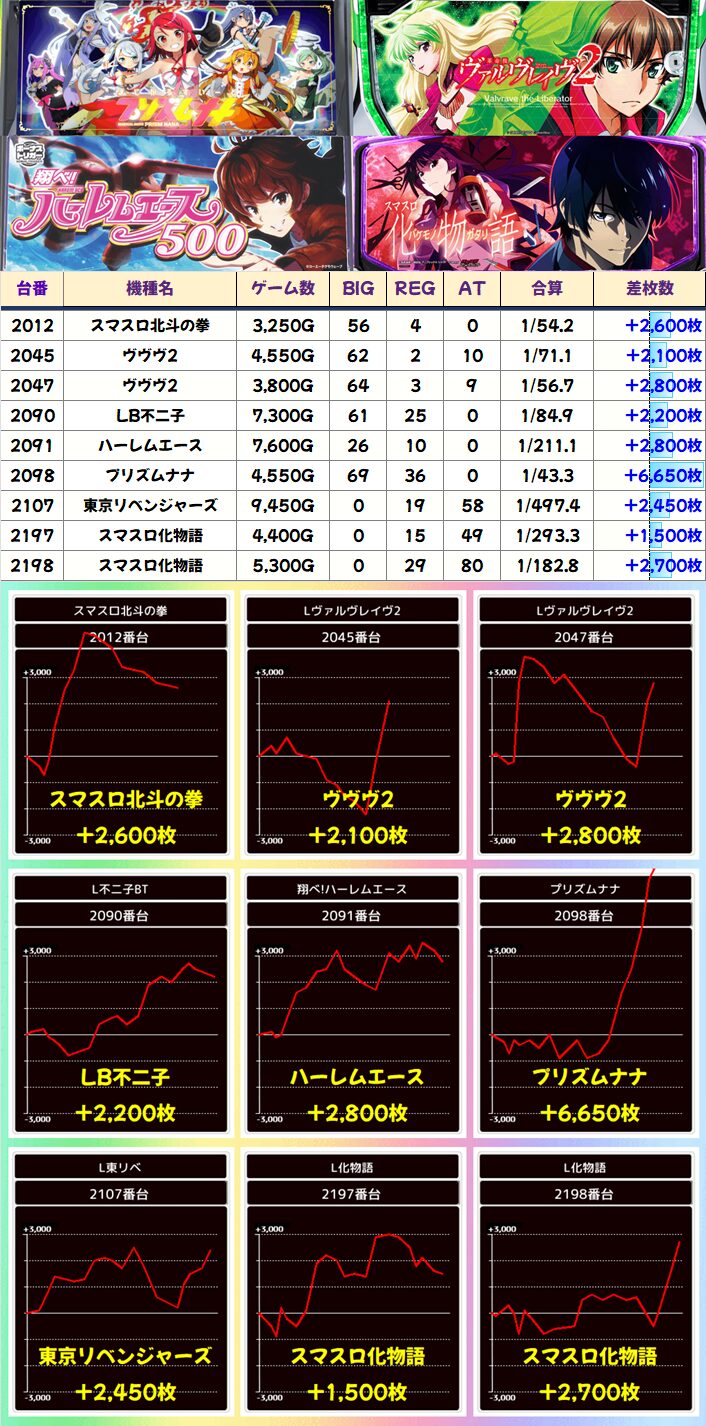 やはり渋谷本館初となる先バレ(上の画像の右側のサンちゃんがそれ)は強かった!1/4の記録を早くも塗り替える、約12万枚のプラス差枚を達成です!今後、LINE配信で先バレが発生した場合は、より注目しておくべきと言えるでしょう!