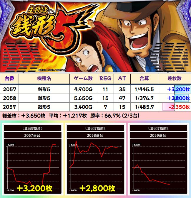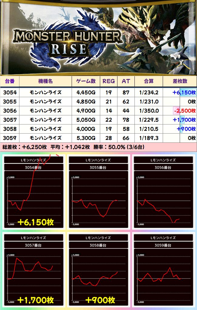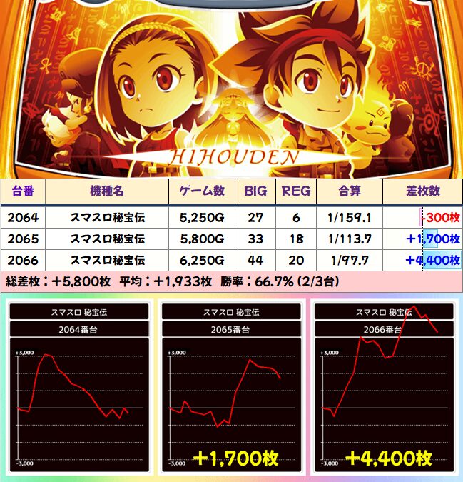 2064番台は出玉が削られてマイナス終了ですが、他2台はしっかりキープ。REGの回数をみても初当りが優秀な状況と見てよさそう?