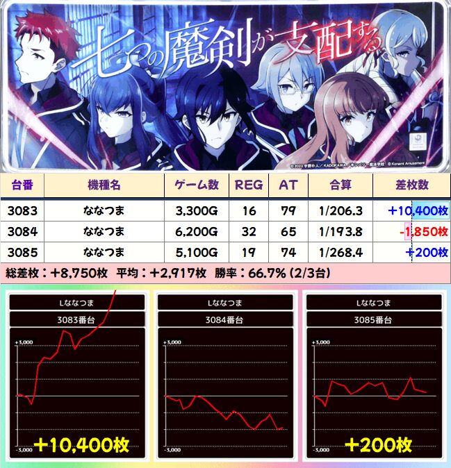 プリズムナナの一撃が目立ってますが、そこにいきつくまでも粘りが見られます。高設定はチャンスで伸ばす機会を待つ展開になりがちか?