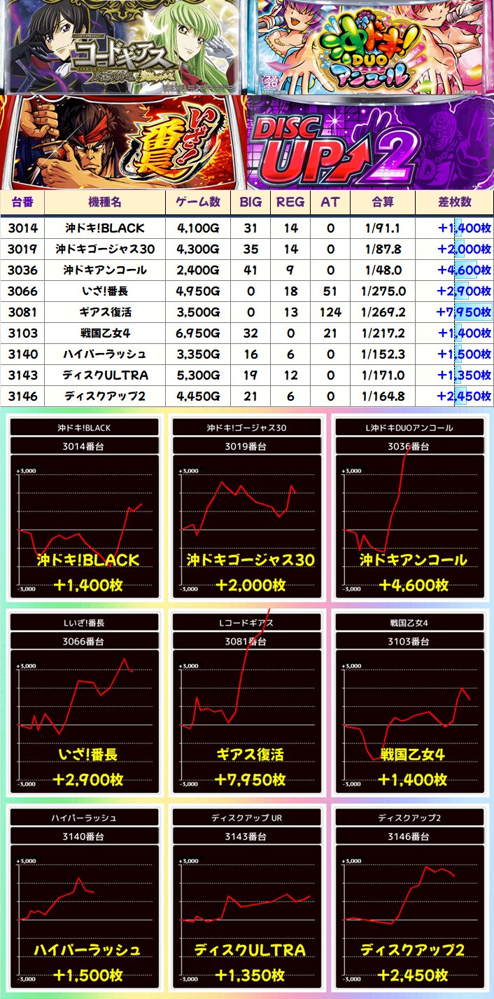 まだ3台設置で奮闘中のギアス復活から8000枚に届く出玉が。中盤の一撃を決めるまでの展開も比較的優秀です。