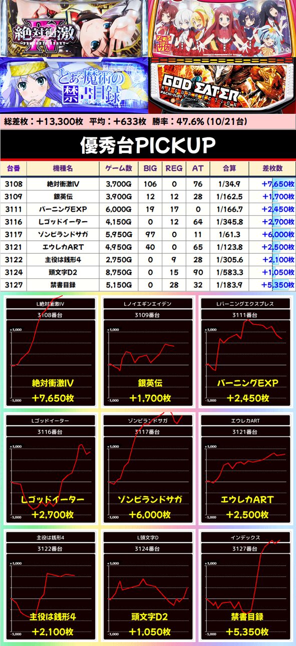 絶対衝激が派手な一撃、ゾンサガはリベンジ突入から出玉を伸ばした後も安定。バラエティに移動した禁書目録は、この日もしっかり出ている上に安定してますね。
