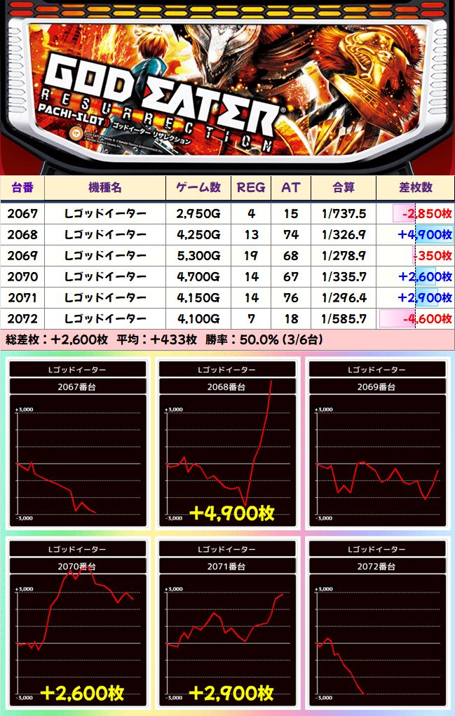 2068番台も戦えているように思えますが、やはりAT中の展開次第で伸ばせない…といったところでしょうか。2068番台はドラマチックな逆転劇に。