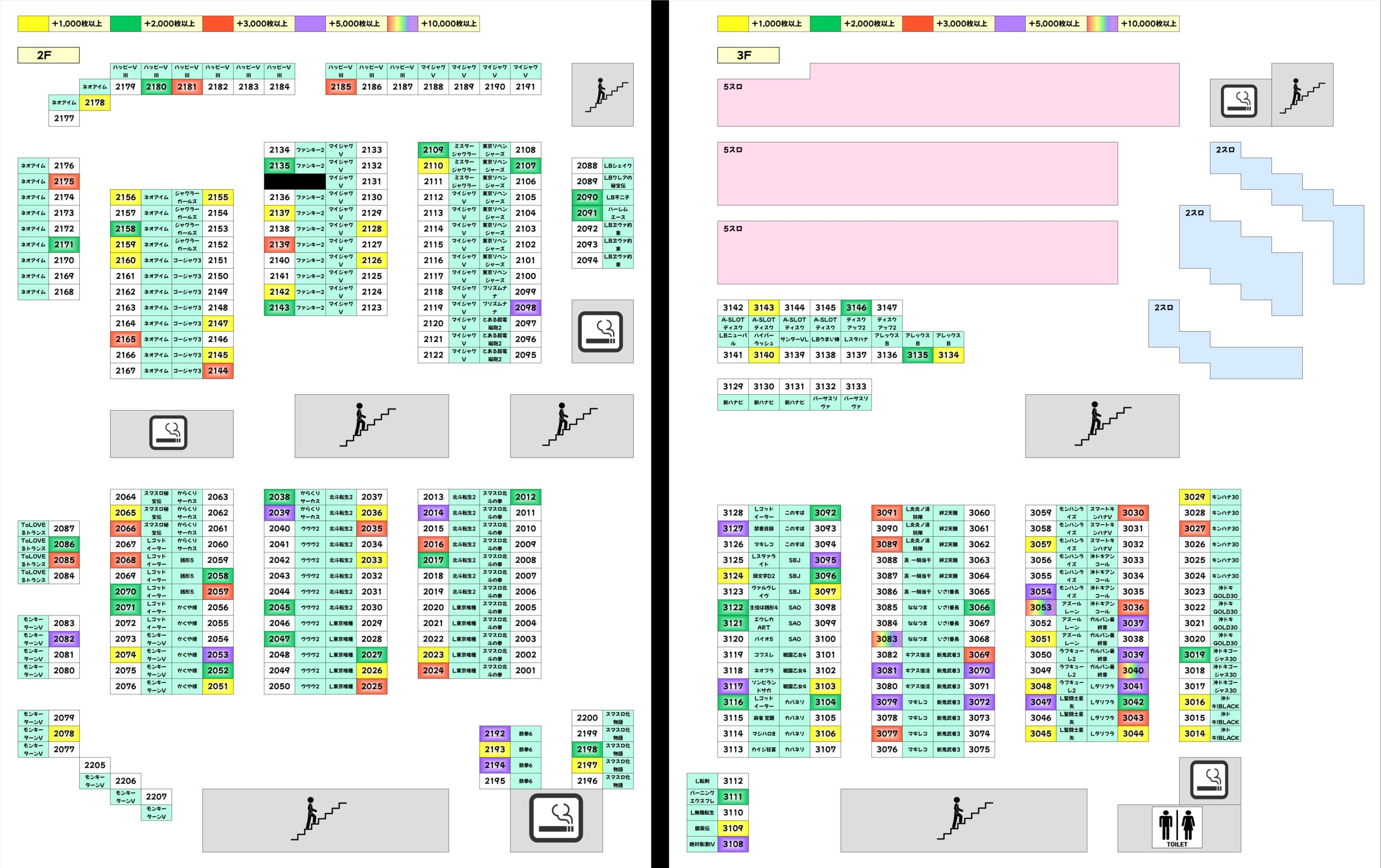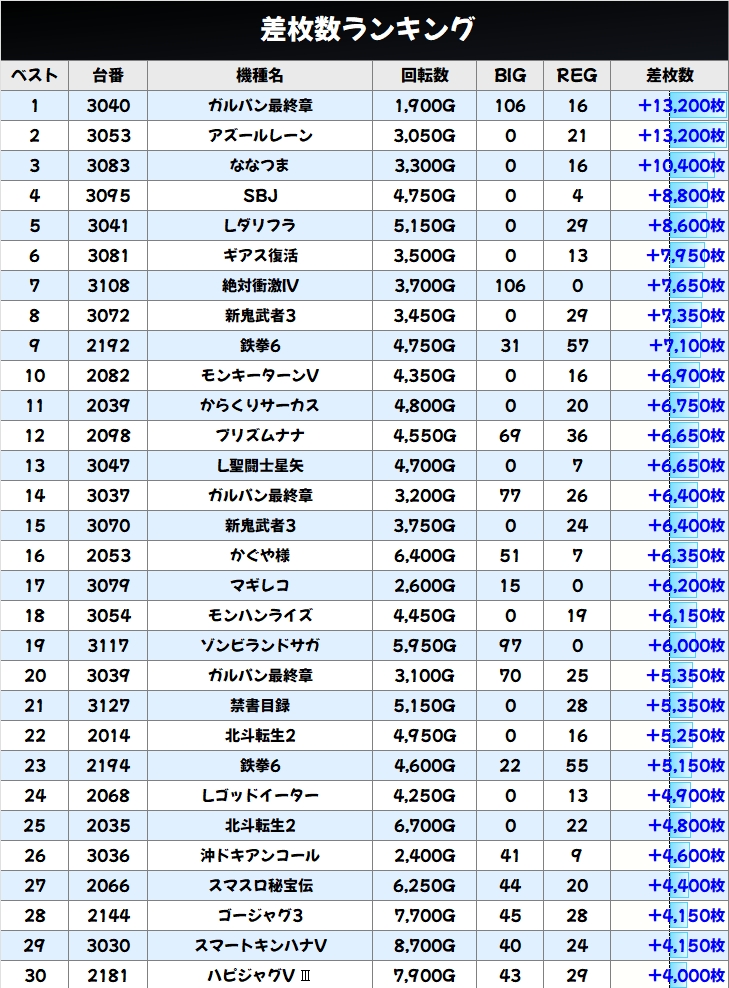 今回、上位30機種のうち、18台が3階から出てきたものです。高配分仕掛けがかなりあったこと、万枚が3台も出ているとはいえ、かなり強かったのも事実。3台設置でもしっかり投入してくるのが、渋谷本館の日曜と言えます。好きな機種があるならぜひ狙ってみましょう。