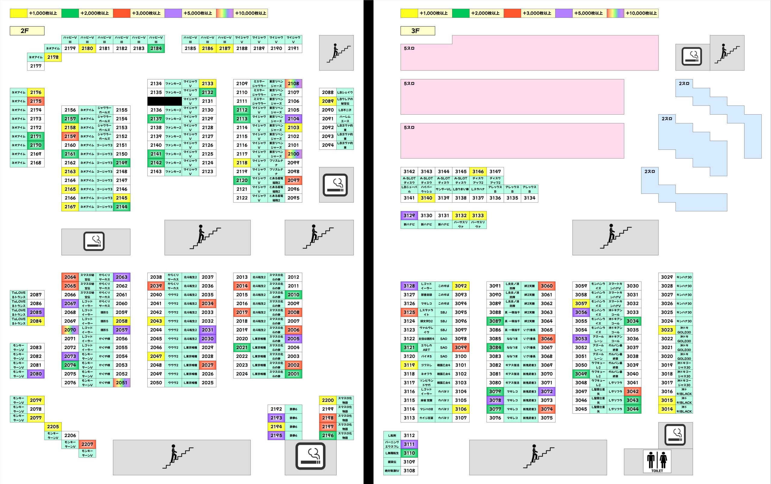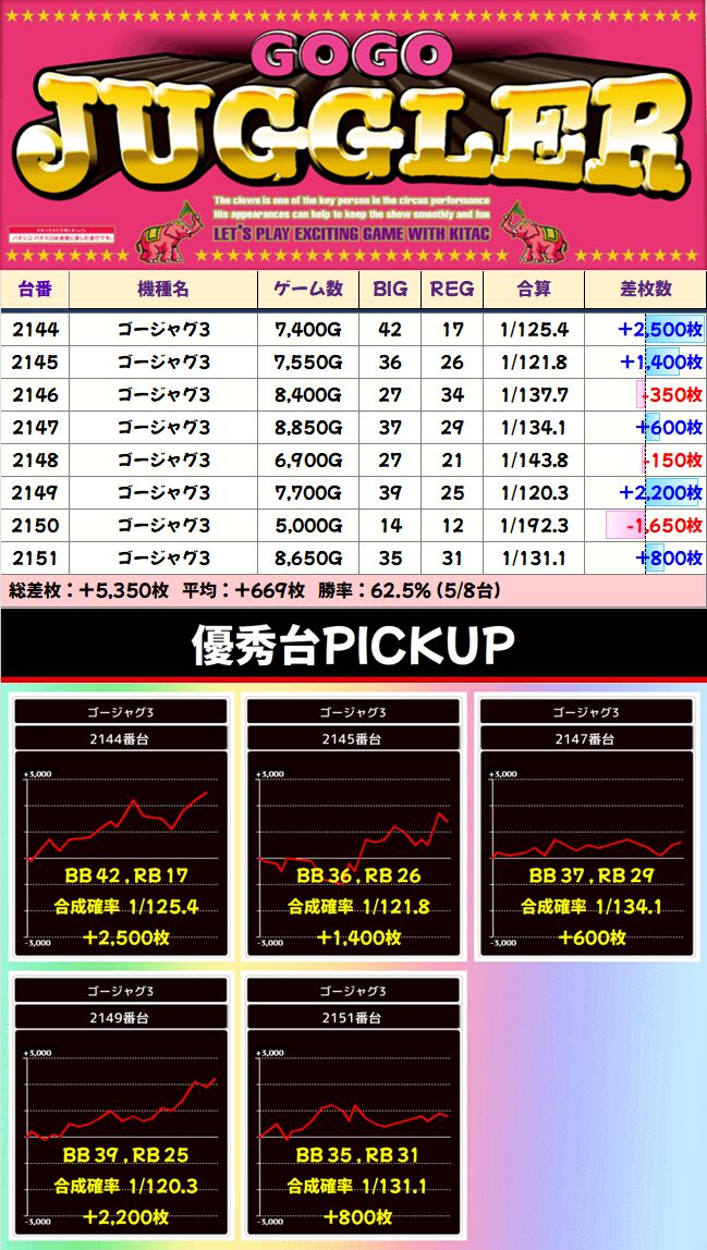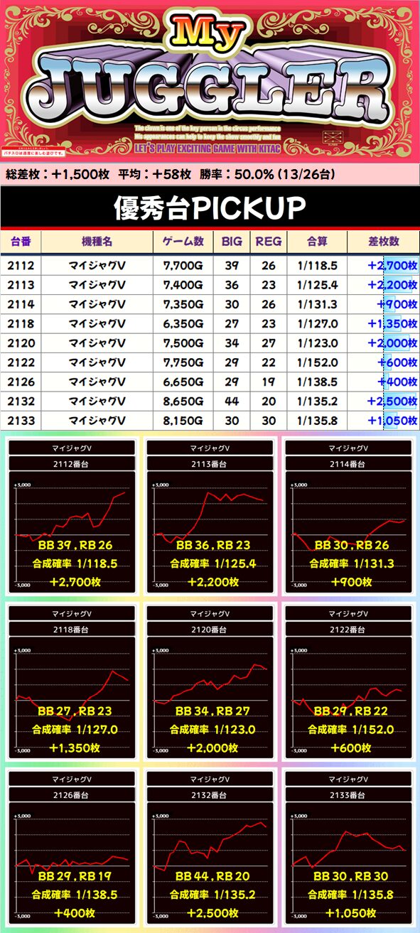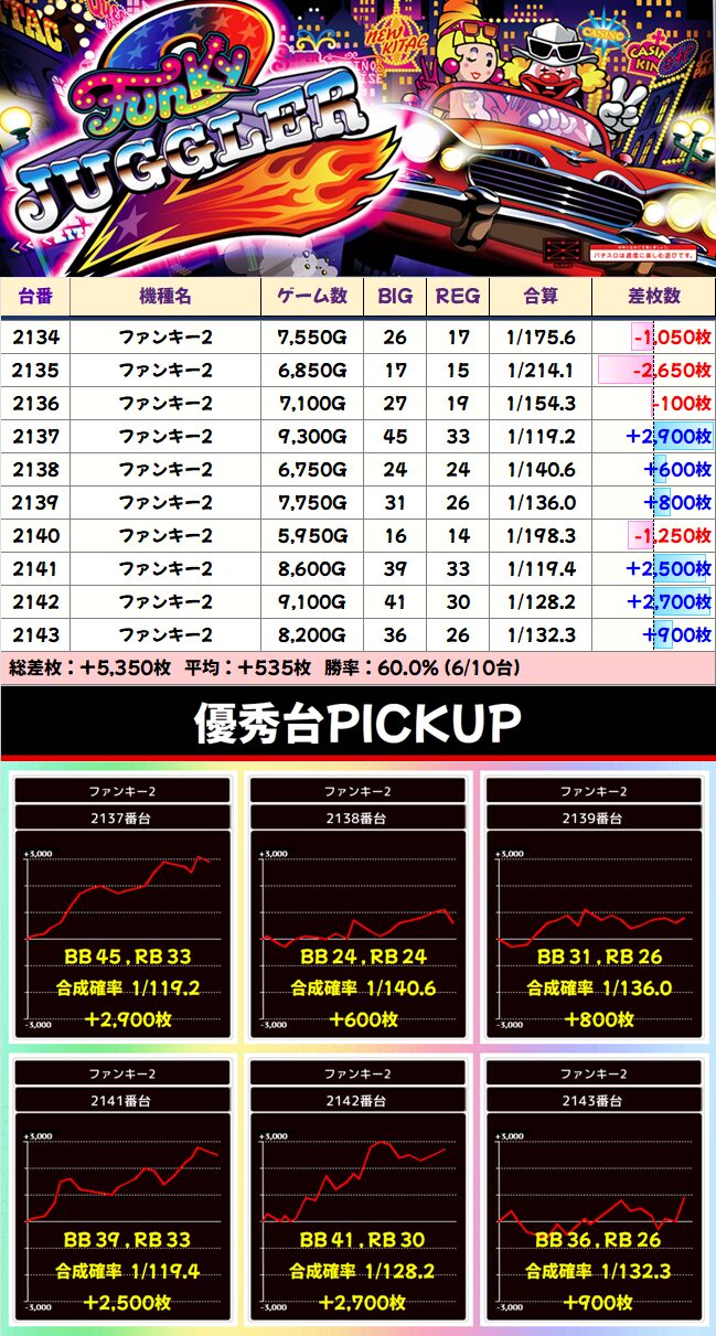 今回まとめていくと、強かったのは2Fのメイン機種関連です。2F・ジャグ・3Fでカテゴリ別にまとめておりますが、2Fに高配分と思われる機種が多いまとめ結果となりました!