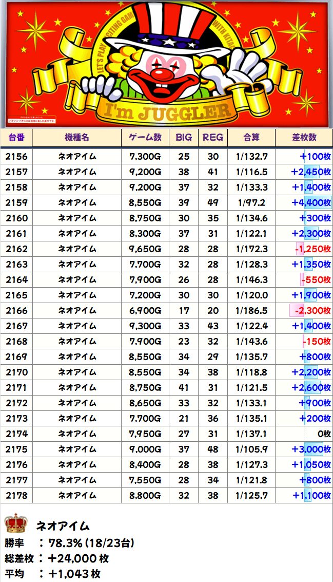 そして日曜日となる最終日は、台数の多いネオアイムに仕掛けられたとみて間違いなさそうです。後程まとめます!1/20と1/21は1台平均差枚が2000枚を超えるジャグがあるなど、かなり強いことがわかりますね。