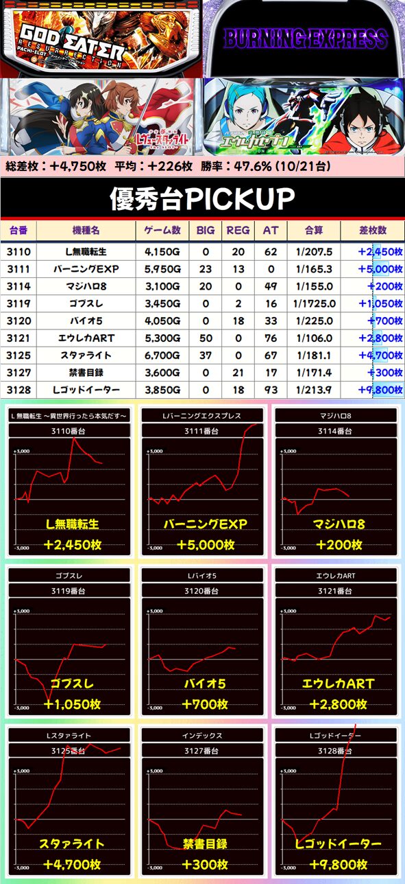 バラエティのゴッドイーターから実質万枚が飛び出してます。他ではバーニングエクスプレスが上位到達から伸ばしたり、スタァライトの一撃→粘りの展開にも注目。